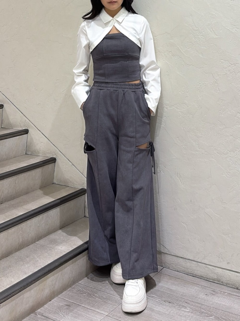 【トップス】 シャツレイヤード風のスウェットトップスです✨ ビスチェ部分は後ろがしっかりゴムが入っているので、伸縮性があるのに加え、胸元が開きすぎてしまうことなくお召しいただけます♪ 【ボトムス】 ついついダル着に見えがちなスウェットパンツも、カットリボンのデザインが一味違うふうに演出してくれるのが嬉しいポイント💭 セットアップできるとさらにオシャレ感を出すことができます✨