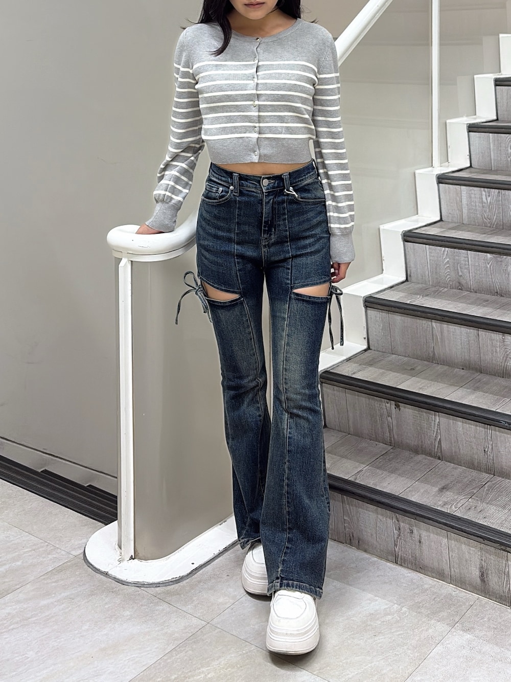 【トップス】 毎年定番で出ている、ベーシックなカーディガンです♪ もはや合わない洋服がないくらい、万能に使いやすいので一枚持っておくとトップスとしても、羽織としても重宝すること間違いナシですき✨ 【ボトムス】 大人気のカットアウトリボンデニムの、2番目に濃いお色です🫧 正面の加工が、ハイライトの役目を果たしてくれるため足がすらっと見えるのが特徴のお色味です✨ 163cmでSサイズの丈感がちょうど良く着ることができました◎