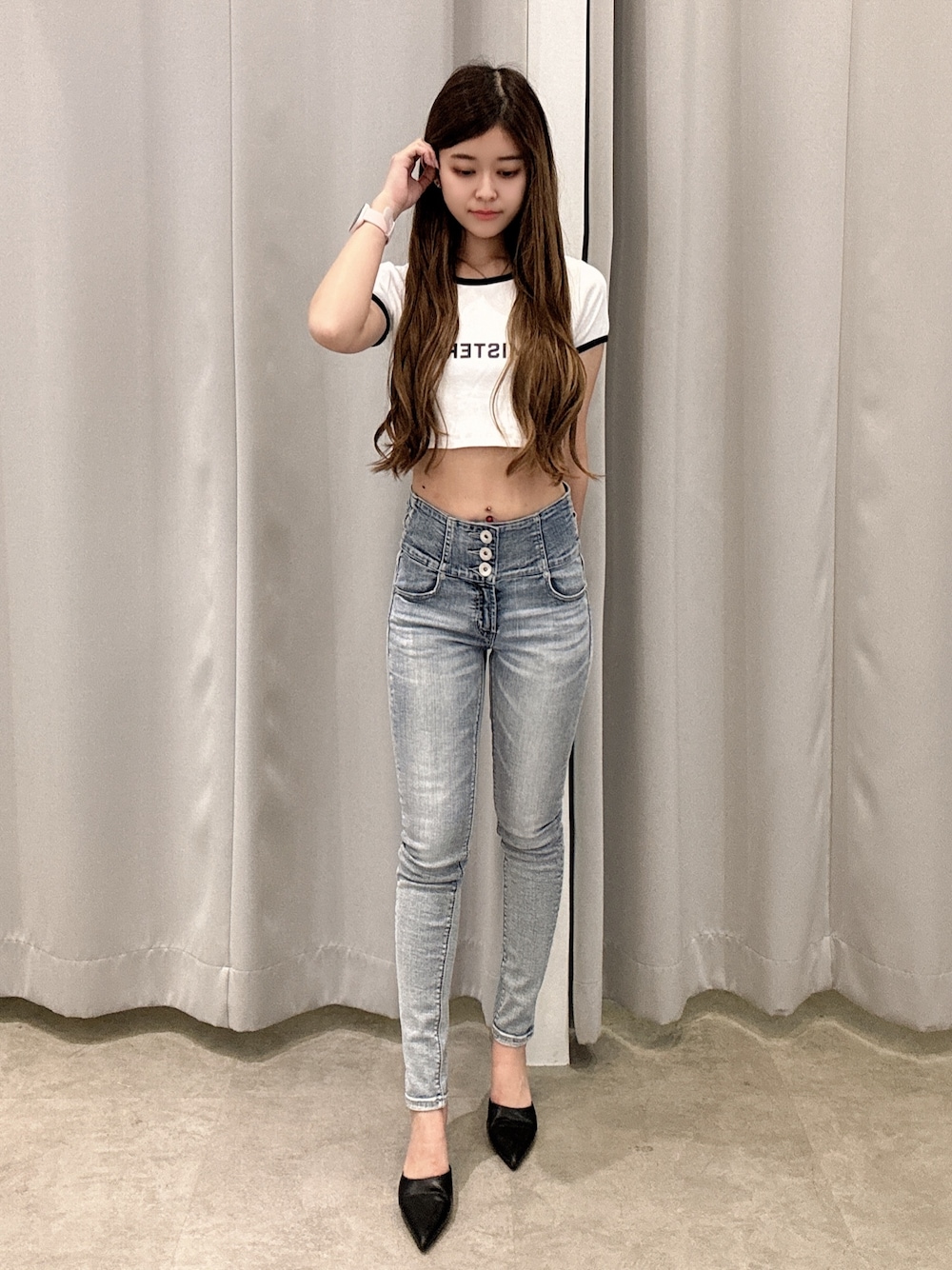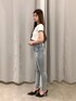 シンプルだけどスポーティなTシャツ❤︎ デニムはサイドからウエスト部分にクロスのデザインが入ってるので肌見せが可愛いです♪靴はシンプルなミュールで✨