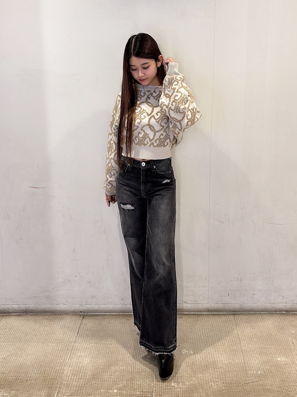 スタイルUPコーデ♪ 【トップス】 GYDAのロゴが大胆に入ったニットです❣️ラメが入ってるので、着るだけでゴージャス感が増す1枚です✨ショート丈なのでハイウエストのパンツと合わせて頂くとスタイルUPに🆙 【パンツ】 裾・バックにレースデザインが入ったワイドデニムパンツです❣️甘くなりすぎないようにさり気なく見えるのが可愛いです♡150㎝でSサイズ着用で、裾少し余りますがヒール履いたら丁度よく着用出来てます✨ 【靴】 ヒールの高さが13㎝ある厚底ブーツです♪ヒールの部分が太めに作られてるので安定感があります🥹厚底なので美脚効果が期待できます‼️23.5㎝でMサイズでピッタリ履けてます!