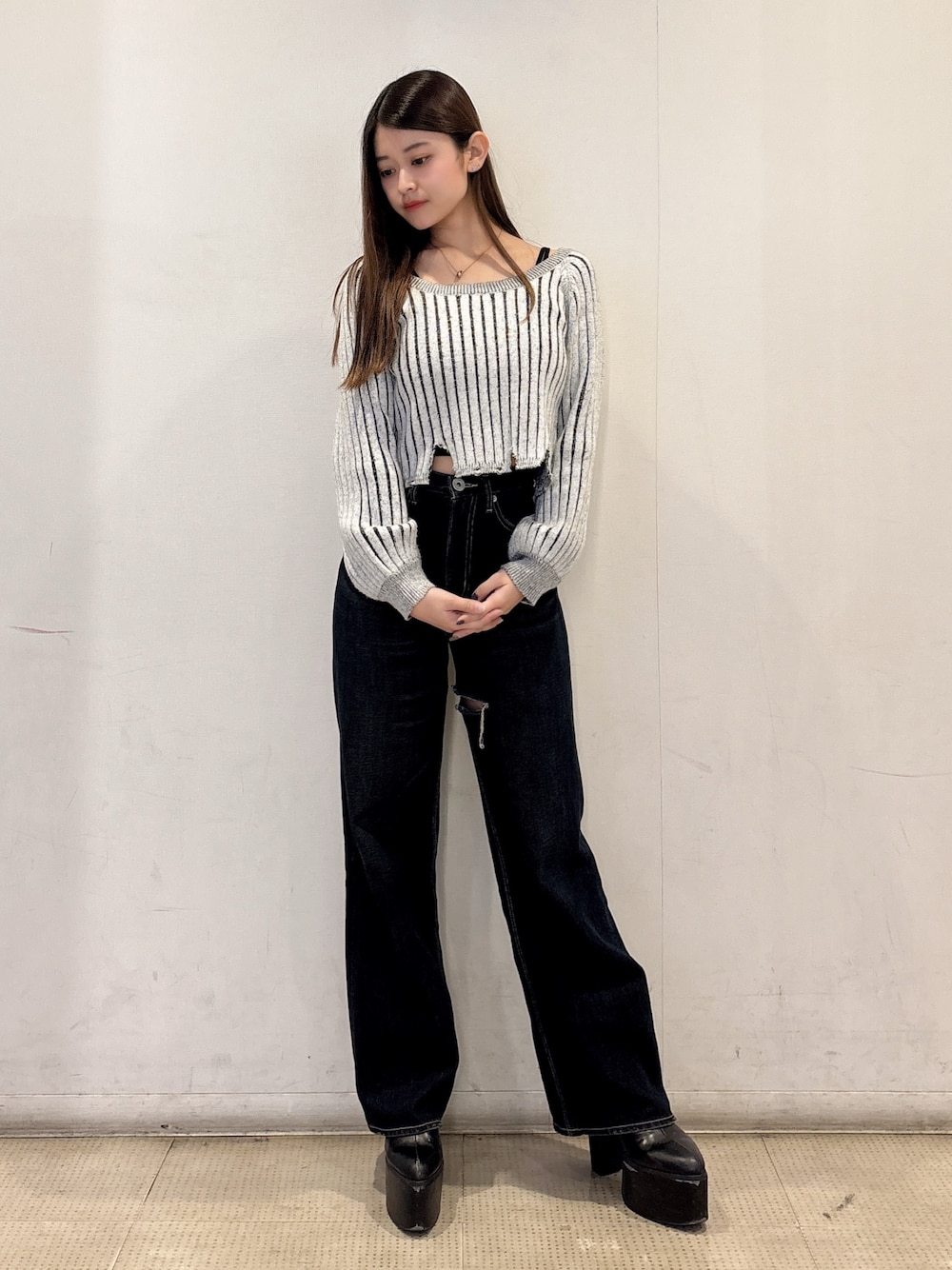 【トップス】 裾がグラインダーになってるトップスです!オフショル・ワンショル、お好みで着用できます◎ショート丈なので、ハイウエストのボトムスと合わせてスタイルUPに✨ 【インナー】 カップ付きのキャミソールです♡シンプルなので、トップスとしても使えます◎無地でショート丈なので、どんな洋服にも使えます🥹 【パンツ】 インナーにダメージが入ったワイドデニムパンツです❣️ワイド過ぎず、ストレートのシルエットも入ってる万能デニムです♡身長150㎝のSサイズでちょうど良く着用出来てます! 【ブーツ】 ヒールの高さが12㎝ある厚底ブーツです♡高さがあるのに、ヒール部分が太めに作られているので安定感+疲れにくい万能ブーツです✨厚底なので美脚効果も◎23.5㎝のMサイズでちょうど良く履けてます👍🏻