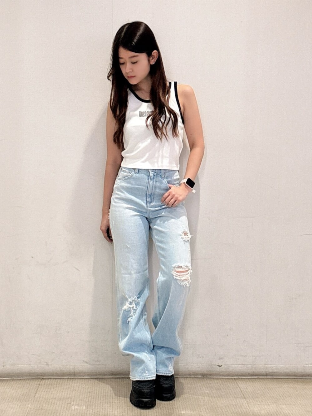 【トップス】 フロントにロゴが入っているタンクトップです!ショート丈なのでハイウエストのボトムスと合わせてスタイルアップ効果があります♡ 【パンツ】 ダメージが入ったストレートワイドパンツです!ダメージが少ないので、どんなコーディネートにも合わせやすいです!ハイウエストなのでショート丈のトップスと合わせてスタイルアップ効果も◎✨150㎝のSサイズ着用しています! 【シューズ】 GDメッキがついたスニーカーです!厚底ですがクッション性が効いているのでとにかく歩きやすいです😳GDメッキは取り外し可能です◎23.5㎝のMサイズ着用しています!