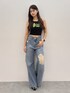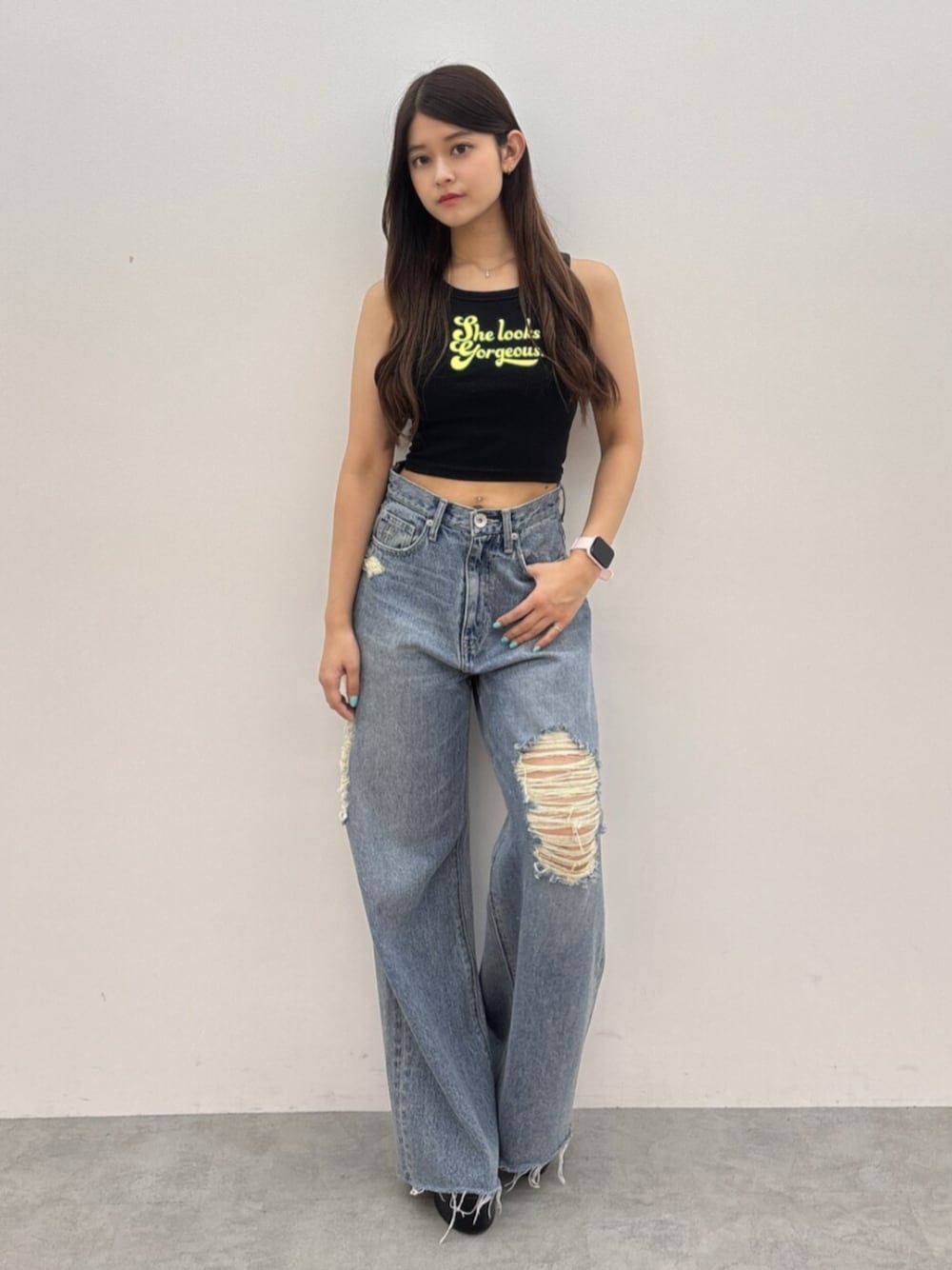 【トップス】 ネオンカラーのロゴが入ったタンクトップです!ショート丈のタイトシルエットなので、ハイウエストのワイドパンツ等合わせるのがオススメです! 【パンツ】 ダメージが大胆に入ったワイドパンツです!ハイウエストなのでショート丈のトップスと合わせてスタイルアップしてみえます❣️コインポケットには、クロスポイントが入っています🩷150㎝のSサイズ着用しています! 【シューズ】 シンプルなチャンキーサンダルです!高さが13㎝ありますが、ヒール部分が太めに作られているので安定感があってとにかく歩きやすいです!23.5㎝のMサイズ着用しています!