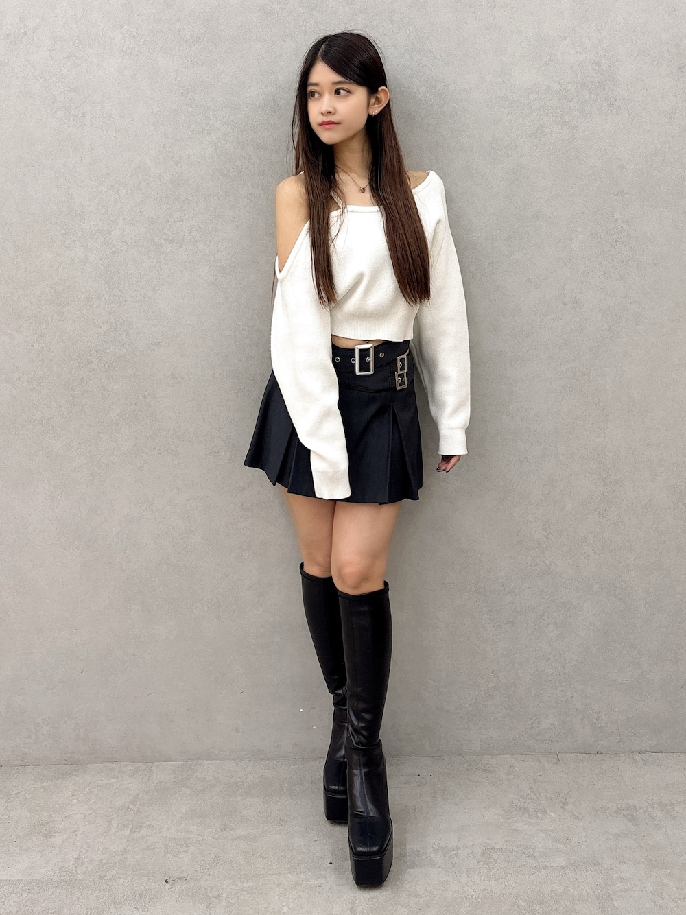 【トップス】 胸元にSymmetry GYDAロゴが入ったワンシャルトップスです!肩紐がチェーンになっているのがポイントです♡ショート丈なので、ハイウエストのデニムと合わせるのもオススメです✨ 【パンツ】 斜めのベルトがポイントのスカートです♪インナーショーツ付いているので安心して着用できます❣️ 【シューズ】 チャンキーロングブーツです!伸縮性が効いているのでとにかく履きやすいです♪ヒール部分が太めに作られているので歩きやすいです✨23.5㎝のMサイズ着用しています!