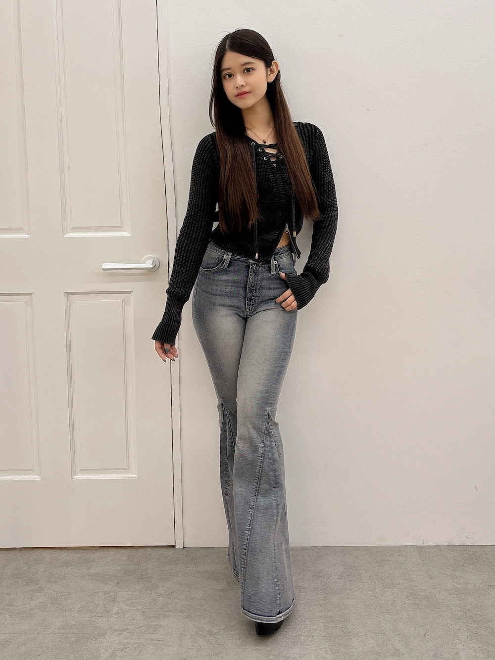 【トップス】 アシンメトリーデザインのニットトップスです!ブリーチ加工されているので重たくならずに着用できます!裾のファスナーを上げて肌見せ出来るのもポイントです✨ 【パンツ】 シンプルなフレアパンツです!大胆にフレアデザインされているので、美脚効果抜群の1枚です😊👍🏻150㎝のSサイズ着用しています! 【シューズ】 シンプルなバルキーショートブーツです!高さが13㎝ありますが、ヒール部分が太めに作られているので安定感があり歩きやすいです!美脚効果間違いなしの1足です‼️23.5㎝のMサイズ着用しています!