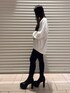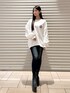 【トップス】 ドルマンスウェットトップスです!前はシンプルで後ろが大胆にデザインされているのがポイントです❣️ショートパンツ等と合わせてワンピース風に着用するのもオススメです‼️ 【パンツ】 GYDA大人気シリーズ、ウエストクロスデニムパンツです!ショート丈のトップスと合わせるとバッククロスが見えて可愛いです🩷150cmのSサイズ着用しています! 【シューズ】 シンプルなバルキーショートブーツです!高さが13cmありますが、爪先と踵の高低差が少ないのでとにかく歩きやすいです❣️23.5cmのMサイズ着用しています!