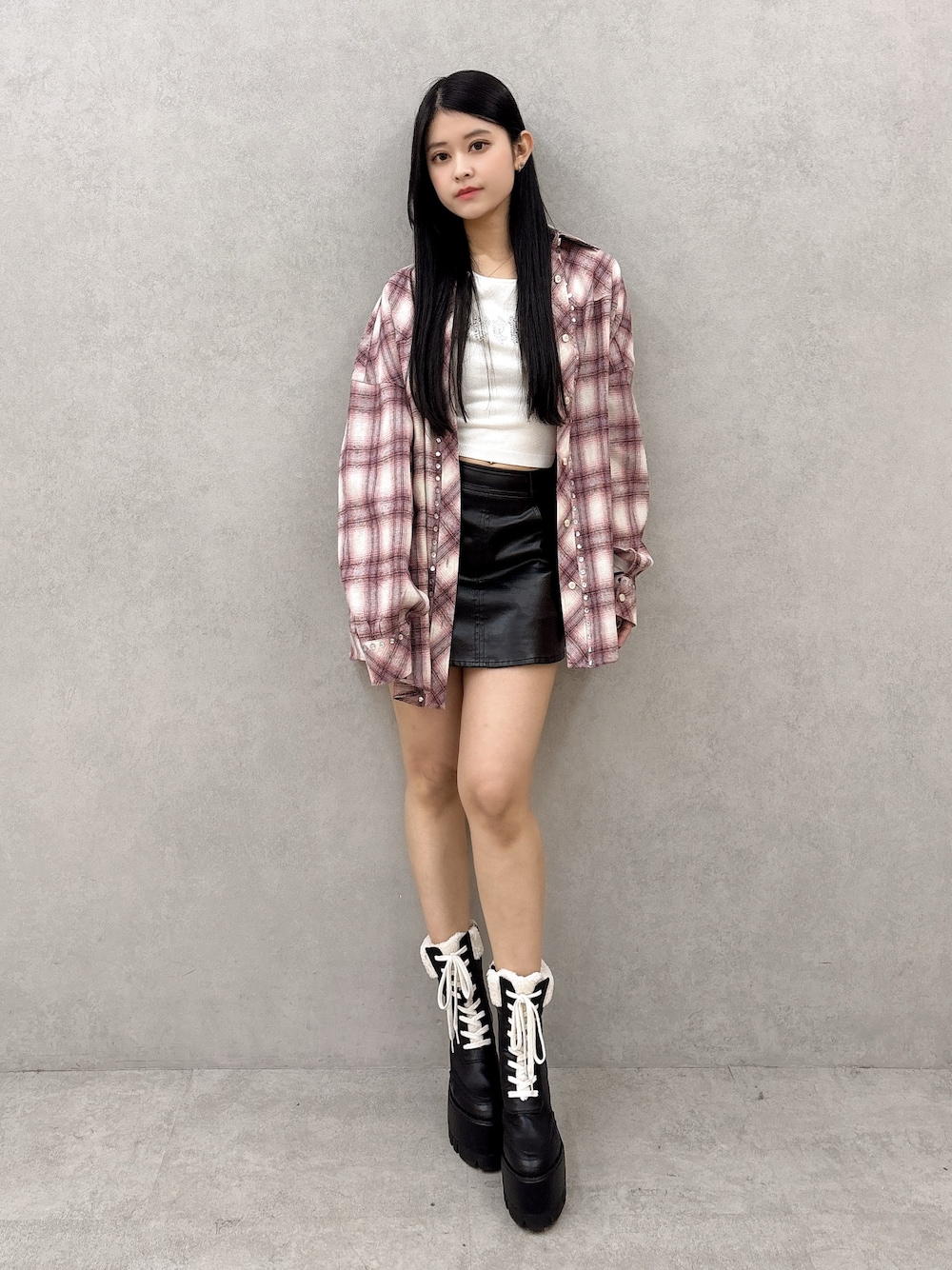 【トップス】 ラインストーンのデザインが入ったトップスです!薄手のニットなので、春でも着用できます◎ 【シャツ】 ビジューデザインのチェックシャツです!ゆったりとしたシルエットなので、どんなコーディネートにも使える1枚です✨ 【ボトムス】 バックジップのフェイクレザースカートです!シンプルなので、どんなコーディネートにも合わせやすいです♪150cmのSサイズ着用しています! 【シューズ】 ボアのデザインが特徴の厚底ブーツです!高さが13cmありますが、ヒール部分が太めに作られているので歩きやすいです!23.5cmのMサイズ着用しています!