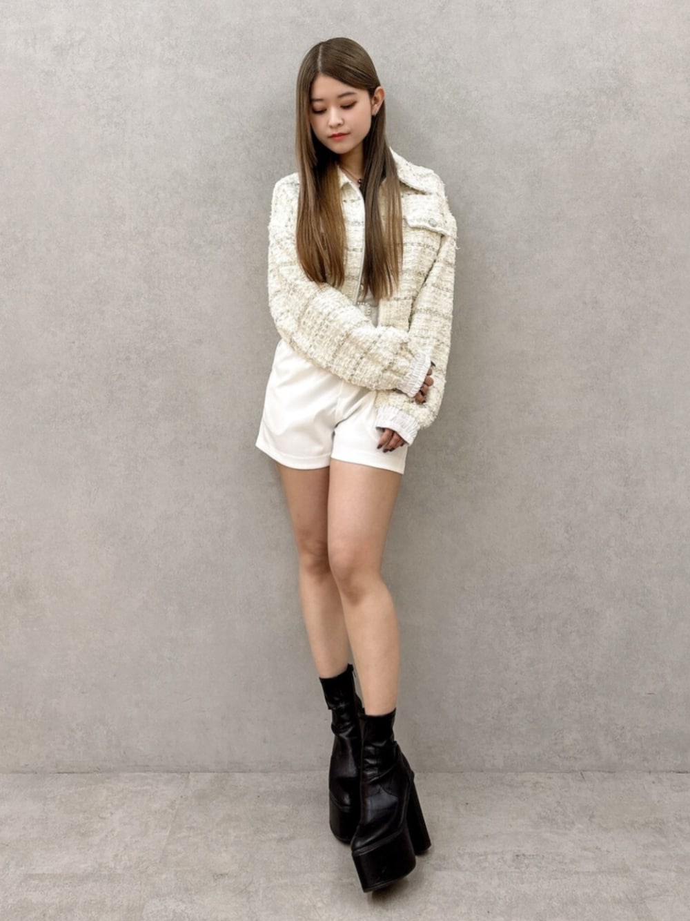 【ロンパース】 肩紐がチェーンになっているロンパースです!ベルトデザインが可愛く、生地がサラッとしているので着やすいです! 【アウター】 ラメツイードジャケットです!Symmetry GYDAのオリジナルボタンが付いていて高級感があります✨ 【シューズ】 シンプルなバルキーショートブーツです!高さが13㎝ありますが、爪先と踵の高低差が少ないので歩きやすく疲れにくいです!23.5㎝のMサイズ着用しています!