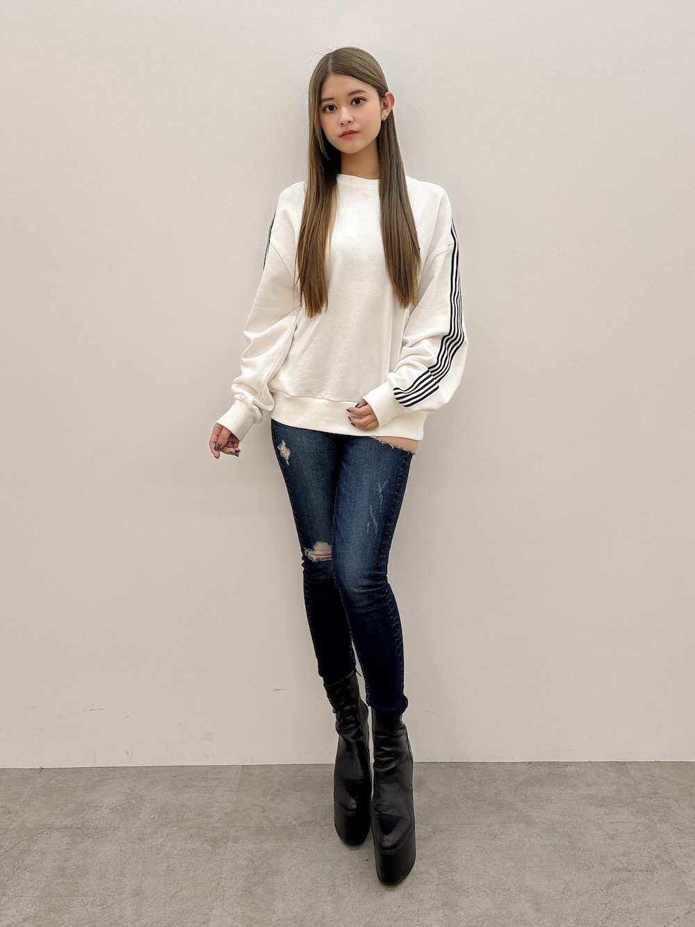 【トップス】 前にはワンポイントのバニー、後ろにはロゴが大胆にデザインされたスウェットトップスです!セットアップで着るのがオススメですが、デニムと合わせるのも◎ 【ボトムス】 GYDA定番のサイドリップドデニムパンツです!ダメージ感がGYDAっぽく着用できます◎150㎝のSサイズ着用しています! 【シューズ】 シンプルなバルキーショートブーツです!高さが13㎝ありますが、爪先と踵の高低差が少ないので歩きやすく疲れにくいです!23.5㎝のMサイズ着用しています!