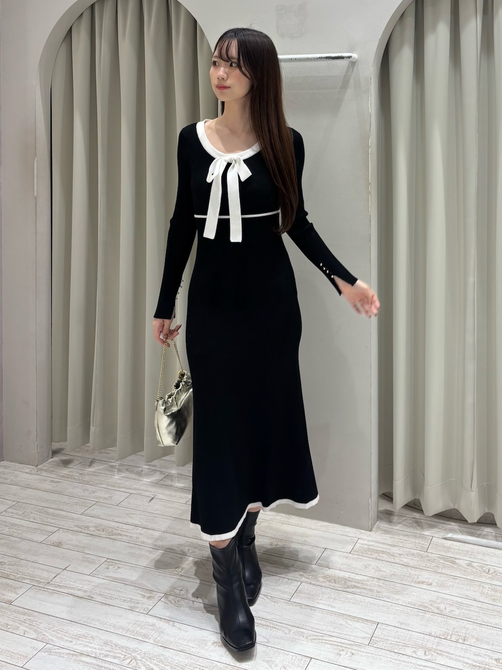 onepiece🌷 シンプルなデザインでシルエットの映える楽ちんニットワンピ♫ バイカラーで高い位置に切り替えラインがあるため、脚長効果もあり細見えも叶います⭐️ マーキュリーのニットワンピは、ウエストはキュッとしますがヒップや太ももはピタッとしない形になっているので、タイトが苦手な方も着ていただきやすいです♫ boots🌷 素材が柔らかいフェイクレザーで履きやすさ抜群❕履き慣らす必要なし❕足に馴染んで靴擦れ知らずのブーツです🎶 24.5~25センチの幅広めですが痛くならずに着用できました! bag🌷 巾着のようなくしゅっとした形が可愛いハンドバッグ♡マグネットで開閉出来るようになっており、柔らかい牛革なので意外と収納力も⭕️ レザーの紐でショルダーバッグにも、チェーンでハンドバッグにも使えるのが便利です👍🏻