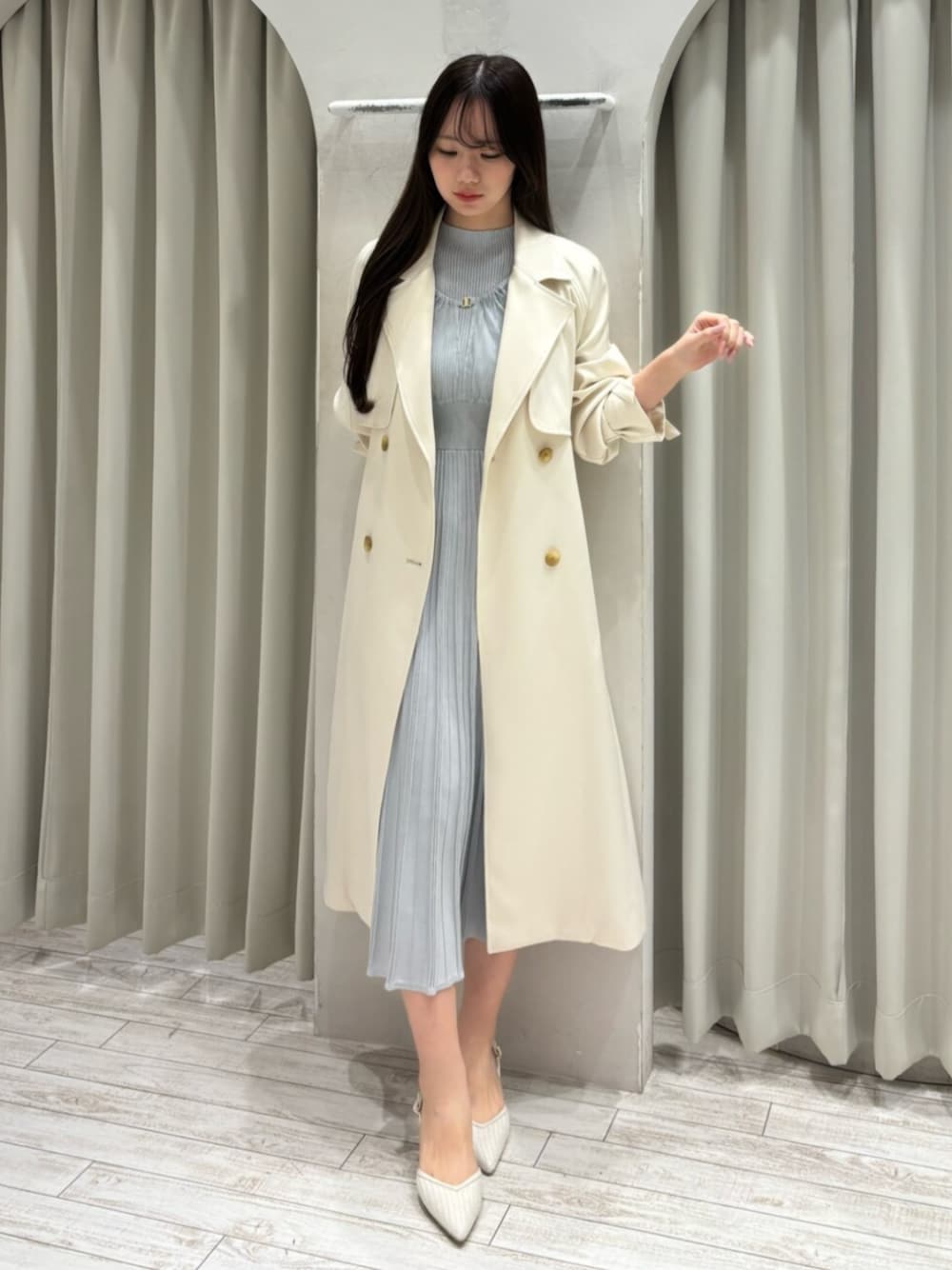 coat🌷 後ろのチュールが女性らしさ満開のトレンチコート🌸軽くてシワになりにくい素材なのも、使い心地抜群なポイントです⭕️ 前から見たときはシンプルなのでカジュアルコーデに合わせてもおしゃれに決まります🎶 腕周りもゆったりしていて厚手のニットに羽織っても大丈夫!背中もケープのお陰で着膨れにくいです(`・ω・)b⭐️ onepiece🌷(ライトグレー/Mサイズ) 前回即完のオフショルニットワンピが5分袖になって再登場⭐️ニットワンピはタイトになると思われがちですが、このワンピは立体的なプリーツのお陰で身体のラインを拾わず細見えします😻❤️ しかも締め付け感もなく、ファスナーもないので脱ぎ着も楽ちん🎶 オフショルにも、肩を出さずにも着られるデザインです(`・ω・)b⭐️ shoes🌷 ポインテッドトゥで、すらっと綺麗な脚に見せてくれるミュール✨️中のクッションがふわふわ、そしてとっても軽いので細めのヒールでも疲れにくいです⭐️ 普段25センチ幅広めの足でもスッキリ見えて有難い😻ストラップが調節可能なため、1番大きくしたらサイズも大丈夫でした⭕️