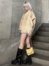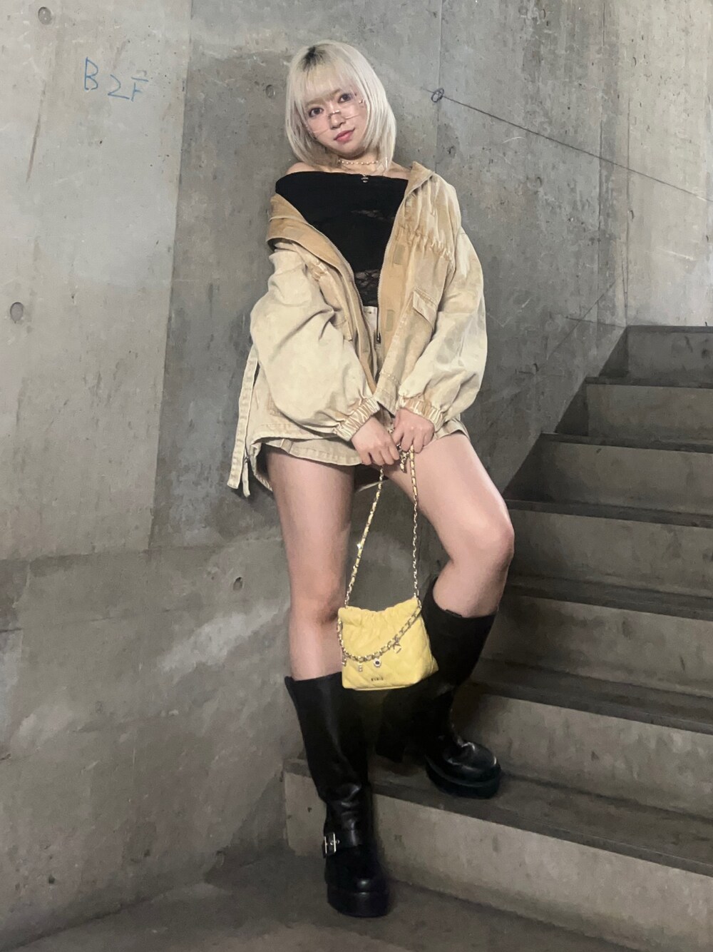 アウター セットアップアイテム💭 オーバーサイズのブルゾン! 襟元立てれたり、ウエスト絞れたり、 色々な着方が出来るので着回しできます! トップス トレンドのレースでできたらオフショルトップス💭 程よい肌見せ感で色っぽく着れます🩷 スカート セットアップアイテム💭 ワイドベルトが特徴的でウエストがしっかり細く見えます! ローウエストで履けるスカートですが、私はハイウエストが好きなので ハイウエストで履いています! なのでかなり丈感短く見えますが、ローウエストで履いたら安心です🙂↕️ 160cm超えていて丈感長めに履きたい方は Mがおすすめです! バック チャームが可愛らしいキルティングバッグ! 小ぶりなサイズ感も可愛くて、EVRISらしい太陽マークも付いています💭 サングラス EVRISにもついにリムレスメガネがでました👓 少しだけ上がったデザインが可愛い💖 中顔面短縮になります! ネックレス クロスがY2Kっぽいネックレス! パールとチェーンの組み合わせが何にでも合わせやすいです! EVRISの3連ネックレスは1個に纏まっているので、絡まったり無くしたりしません🎶 ブーツ しっかり厚底で盛れるブーツ🥾 チャックがないのでスポッと楽ちんに履けます😭 普段23~23.5cmでMサイズがピッタリです!