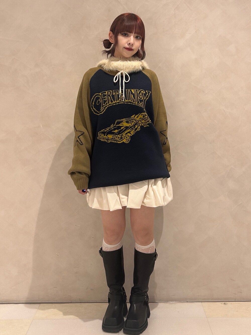 〇ニット 152cmでヒップが隠れる丈感です。 フロントには車、袖には星、1枚で可愛いニットです♡ バルーンスカートを合わせてカジュアルガーリーなコーデにしてみました! デニムでストリートに着たり、ロンクスカートてゆるゆるなスタイリングも可愛いです! 〇スカート トレンドのバルーンスカートです! サイドにはリボンが付いていて、バレエコアが好きな方はマストバイなアイテムです♡ ウエストはゴムになっていて履き心地◎ インパン付きで安心して着用していただけます。 〇バラクラバ コーデのワンポイントとしてバラクラバを付けてみました♡ アウターから出しても可愛いです! 〇ブーツ 23.0cmでMサイズ着用。