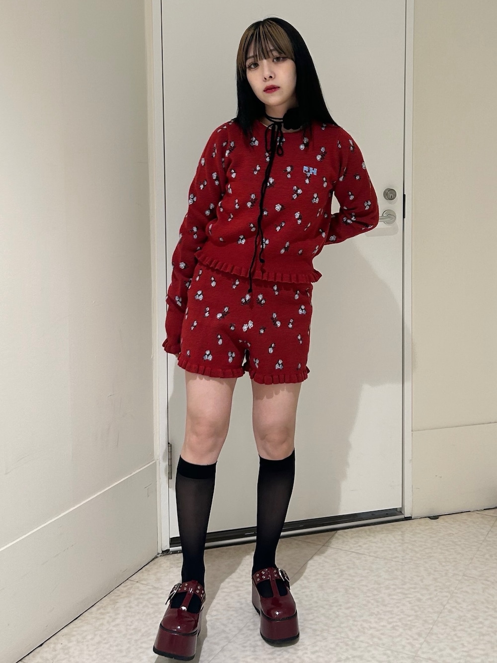 〇ニット セットアップで着用していただけるアイテムです! フリルが沢山で、フィンガーホール付き♡ jouetieとHTHのロゴが水色で刺繍されています! 小花柄との配色がとっても可愛いです! 〇パンツ 裾がフリルなので細見え効果も◎ ニットなので楽に着用していただけます! ウエストは紐付きで調整可能。 ポケット付きも嬉しいです! 〇シューズ 23.0cmでMサイズ着用。