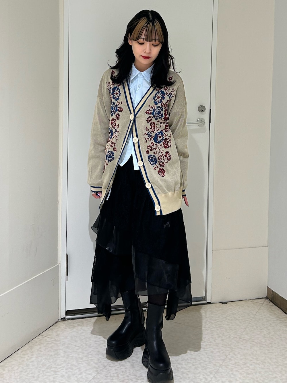 〇カーディガン jouetieらしい配色とお花柄が可愛いアイテム。 152cmでヒップがしっかり隠れる丈感です! 分厚い素材ではないので、着膨れせずスッキリ着られます! 長めなのでショート丈のボトムと合わせて、ワンピース風に着ても可愛いです♡ ○シャツ インナーとしてシャツを使いました! 襟を出すのが可愛い♡ 絞りが沢山付いていて、他のシャツと差別化できるデザイン性抜群のアイテムです! カジュアルに着ても、オケージョンアイテムとしても使えるので、色んな場面で着ていただけます! 〇スカート レース×オーガンジーの春らしいアイテム。 スカートの動きがとっても可愛いです。 ウエストはゴムなので楽に着用できます! 152cmで引きずらない丈感です。 レイヤードアイテムとしてもお使いいただけます。 〇シューズ 23.0cmでMサイズ着用。
