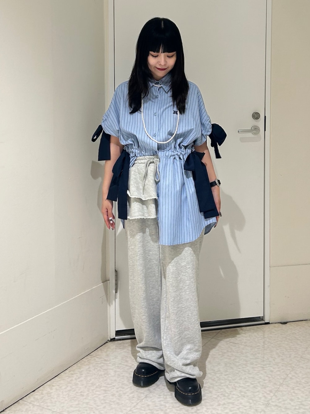 ○スウェットスカパン 1枚でレイヤードスタイルが完成する万能アイテム! 分厚くないので、夏に着用していただいても大丈夫です! 裾は絞れるので152cmでも履けました◎ ○シャツ 1枚で可愛いシャツワンピースです。 サイドのリボンはウエストと袖を調整することができます! 絞らずにゆるっと着ても可愛いです。 152cmでヒップがしっかり隠れる丈感です。 デニムを履いてレイヤードしても可愛いです! 〇シューズ 23.0cmでDr.Martensの4のサイズを着用。
