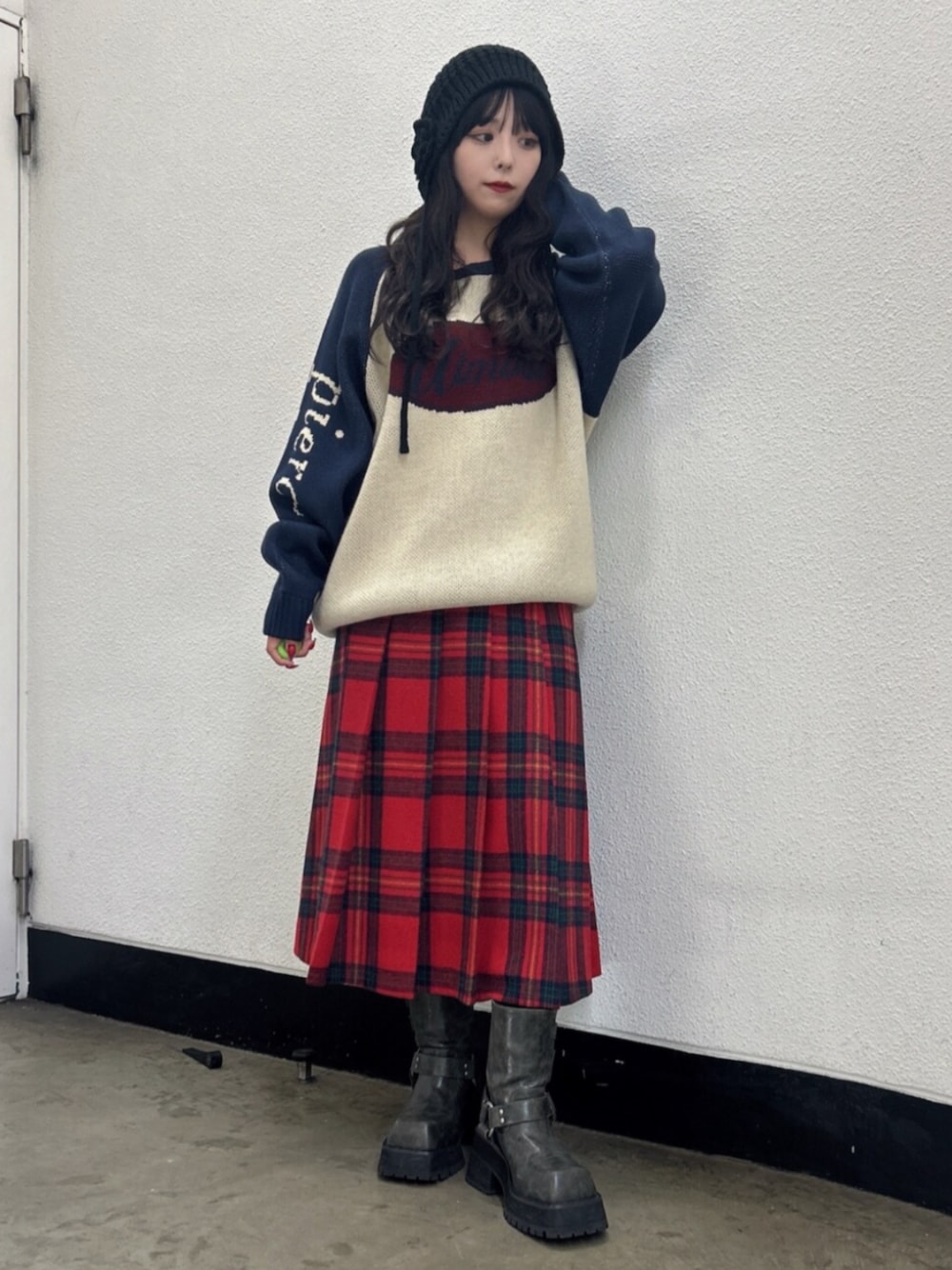 ○ニット jouetie定番のラグランニットです! ルーズ感が程よく体型をカバーしてくれて どんなボトムと合わせても可愛いです♡ 袖にロゴが入っていて、1枚で可愛いアイテムです! ○スカート プリーツが綺麗なミドルスカート。 ウエストはベルトループが付いているのでウエストの心配はありません👌´- デニムをレイヤードして、オシャレ見えも♡ 〇シューズ 23.0cmでMサイズ着用