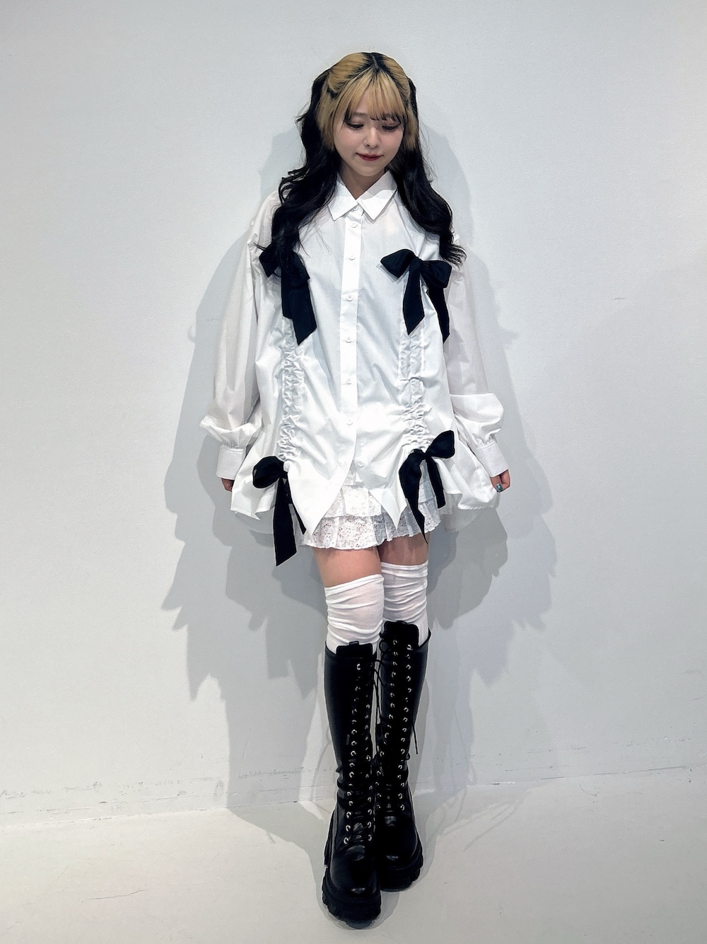 〇シャツ ギャザーは下のリボンで調節可能! 好きな具合に丈感を調節できます♡ デニムに合わせてカジュアルに着ても、スカートでガーリーにも着られるアイテムです! 〇スカート インパン付きのレーススカートをシャツの下に履いています! インパンとしても、スカートとしても使える万能アイテムです! ウエストは紐で調節可能! 〇シューズ 23.0cmでMサイズを着用