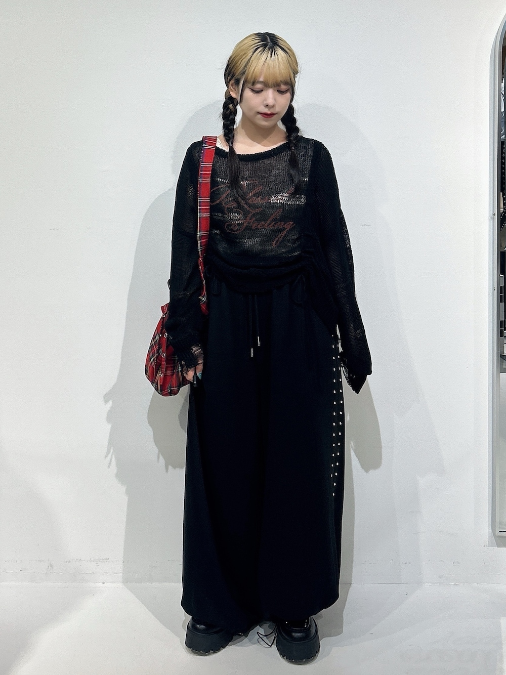 ○シアーニット 夏でもOKなくらい着ていて涼しいです! 網目も大きめでしっかり風通しします◎ フロントのギャザーで丈感を調節できます。 寒い時はタートルなどを仕込んで、レイヤードスタイルも◎ 〇パンツ 絞れるので、152cmでも履けます! 厚底履くのが安心でおすすめです♡ サイドのスタッズがたっぷりでポイント♡ オールシーズン使えるアイテムです! ○バッグ 超大容量なトートバッグです。 1泊2日の旅行なら余裕そうです! 〇シューズ 23.0cmでMサイズ着用。