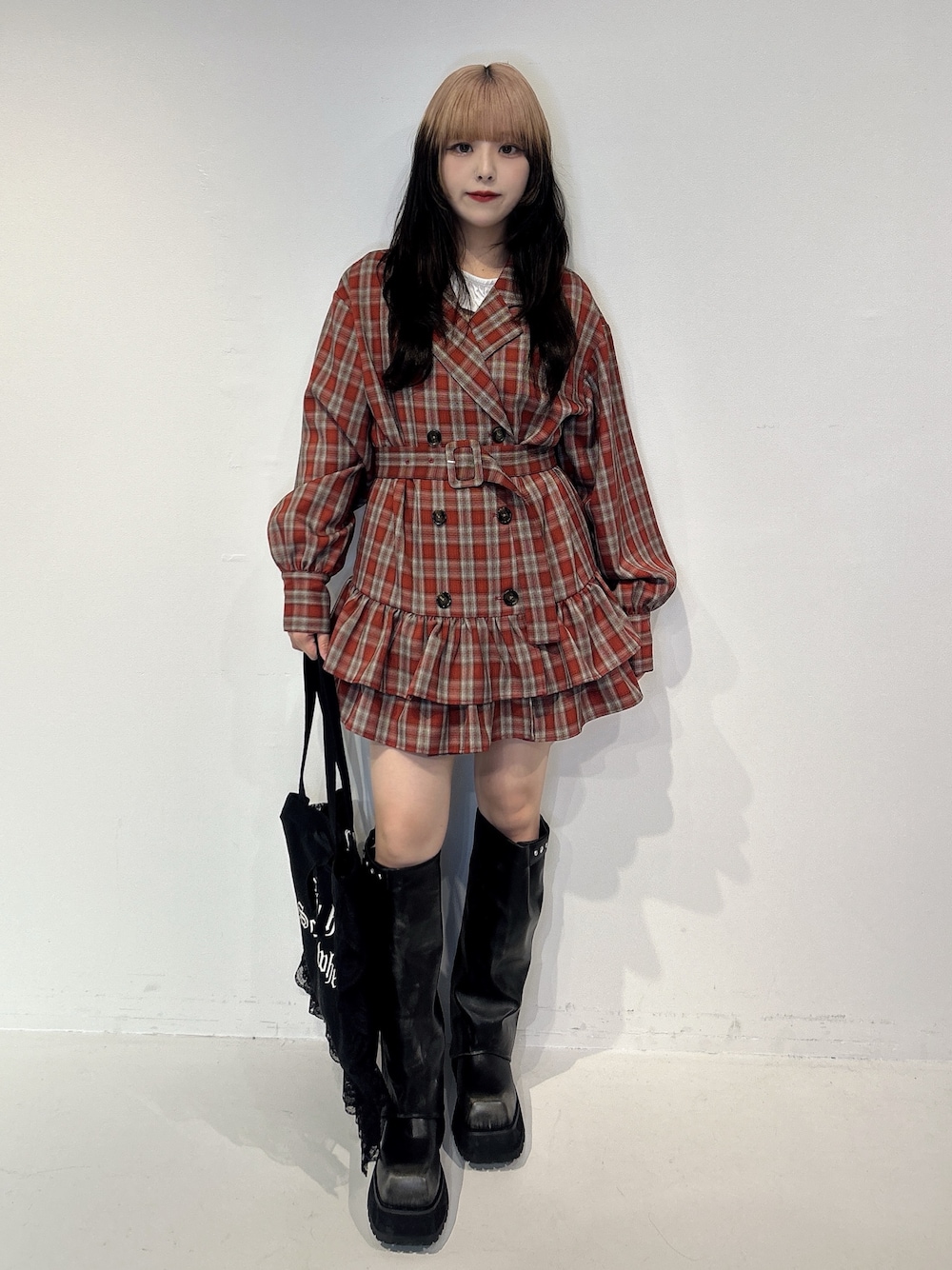 ALICE(jouetie)のワンピース「ヘムフリルトレンチミニワンピース 春服 赤チェック ベージュ グレー」を使ったコーディネート