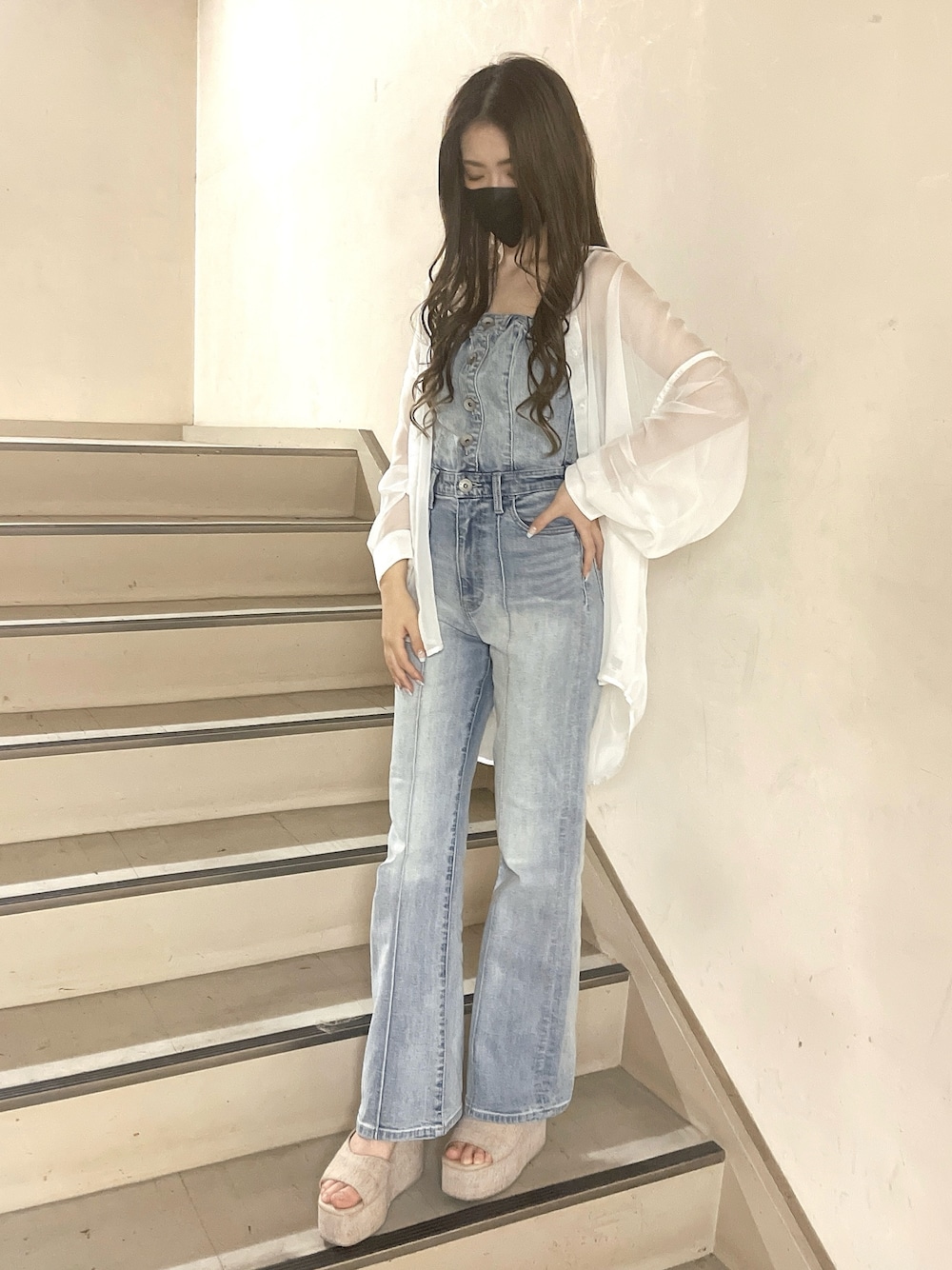 カジュアル夏コーデ🌻 〈ロンパース〉 大人気のBACKリボンデニムロンパース🩷 後ろのリボンがセクシーで可愛いです! ブラックが新色で登場し3色展開です! 上身は締め付け感はなくジャストなサイズ感でバックリボンで調節可能です! ボトム部分はゆるめのフレアで美脚効果抜群で 動きやすいサイズ感です😉 ロンパース1枚で羽織りを着るコーデでもインナーにTシャツを着用しても可愛いです🫶 156cmでXS着用してます😊 〈シャツ〉 毎年大人気のシアーシャツ🩷 さらっと羽織りやすく程よいオーバーサイズ感なので着回し力抜群です! 透け感も程よく体型カバーも出来ます🙂 タイトなワンピースやデニム合わせが定番のオススメスタイリングです! 今回はロンパースに合わせて着用してみました😊 〈シューズ〉 コルクウェッジは夏らしさ全開です☀️ 11cm程のヒールで足長効果は抜群ですが、つま先までしっかり厚底なので傾斜がほとんどなく 見た目以上に安定感があり歩きやすいです😊 23.5cmでMサイズ着用してます! 〈インナー〉 ロンパースの中のインナーはブラトップを着用しています🙂 しっかりホールドしてくれるのでズレる心配なしです!後ろがゴムになっているので自身の体型やバストの大きさに合わせて調節可能です🩷