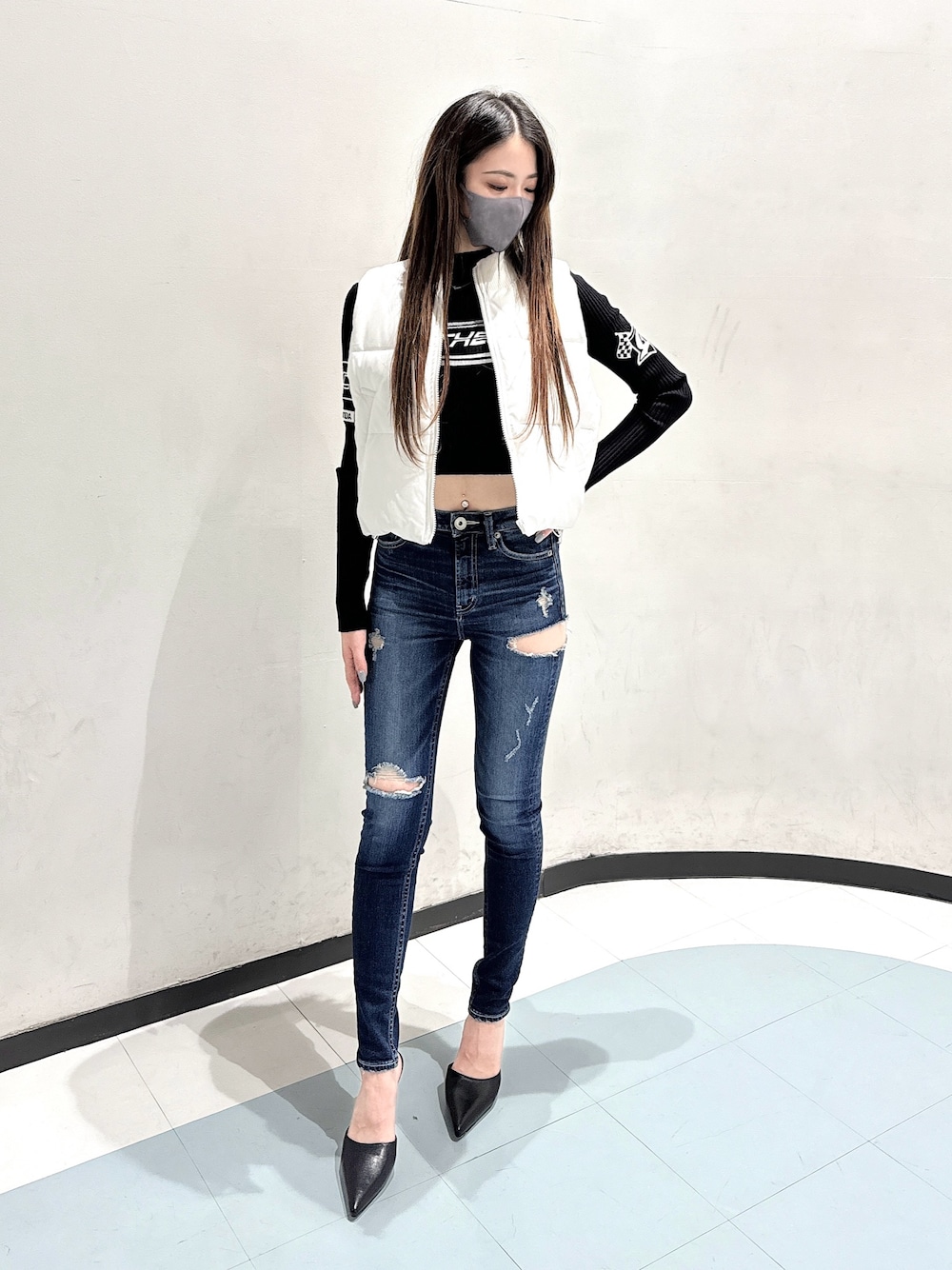 カジュアルギャルコーデ✨ 〈トップス〉 GYDAレーサーデザインのニットトップスです🫶 丈間もミニ丈なのでハイウエストのボトムス合わせてスタイルアップさせても可愛いです🩷 ミドル丈やローライズの丈でおへそが見えるようにするとギャル感めっちゃ出ます😊 〈アウター〉 カジュアルな中綿ベストにフェイクレザーを使用して高級感があるアイテムです✨ サラッと羽織って先取りコーデが出来ちゃいます😊 タイトなトップスやワンピース合わせがオススメです🫶 〈ボトムス〉 GYDAといえばの定番のサイドにダメージが入った人気のデニムパンツです🙂 ヘソ下丈のミドルウエストなのでスタイルアップして美脚効果バツグンです🩷 伸縮性もありとても履きやすいアイテムです!私はIDGのXS着用しています! 〈シューズ〉 GYDAで定番のシンプルなミュールです! デニムを着用する時に履くと足元がスラっとスッキリします😊 カジュアルなコーデにも綺麗系のコーデにも使いやすいシューズです🫶 私は23.5cmでMサイズ着用してます♡