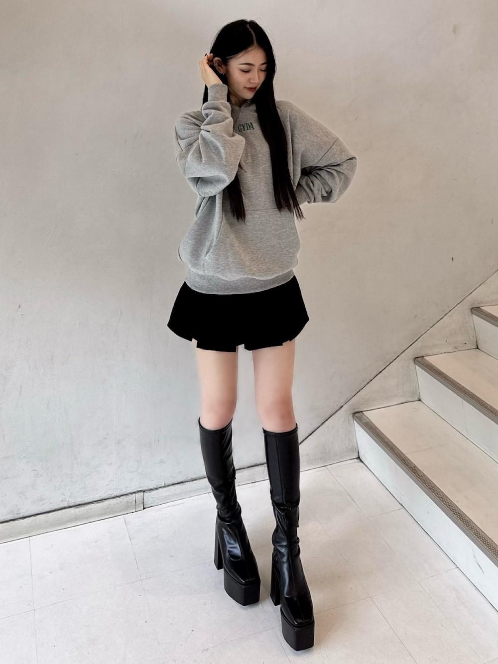 カジュアルコーデ✨ 〈トップス〉 背中にGYDAオリジナルダルメシアンの刺繍があるパーカーです😊 グレーに緑の刺繍がとっても可愛いです♡ 着丈もオーバー過ぎずお尻に少しかかるぐらいの丈間です! スキニーを合わせるとGYDAらしいLAカジュアルなスタイルになります✨ スタイルアップにはミニ丈のボトムスがオススメです🫶 〈ボトムス〉 オリジナルロゴのモチーフ金具が腰についてるプリーツスカートです😊 着崩れしない薄めの生地でプリーツが綺麗に出ます♡ タイトなトップス合わせも可愛いですが、 オーバーなTOPSを合わせて海外スクール風に着こなしても可愛いです🩷 〈シューズ〉 大人気のストレッチチャンキーロングブーツです♡ レッグ周りはタイトですがストレッチ素材を使用している事もあり伸縮性がとてもよく、履き心地もいいので動きやすいです😊 チャンキーソールで安定感もあり美脚効果抜群です🫶 ワンピースやミニ丈のボトムス合わせにはもちろん合いますが、デニムをインするスタイルもカッコよくなりオススメです🩷 私は23.5cmでMサイズ履いてます!