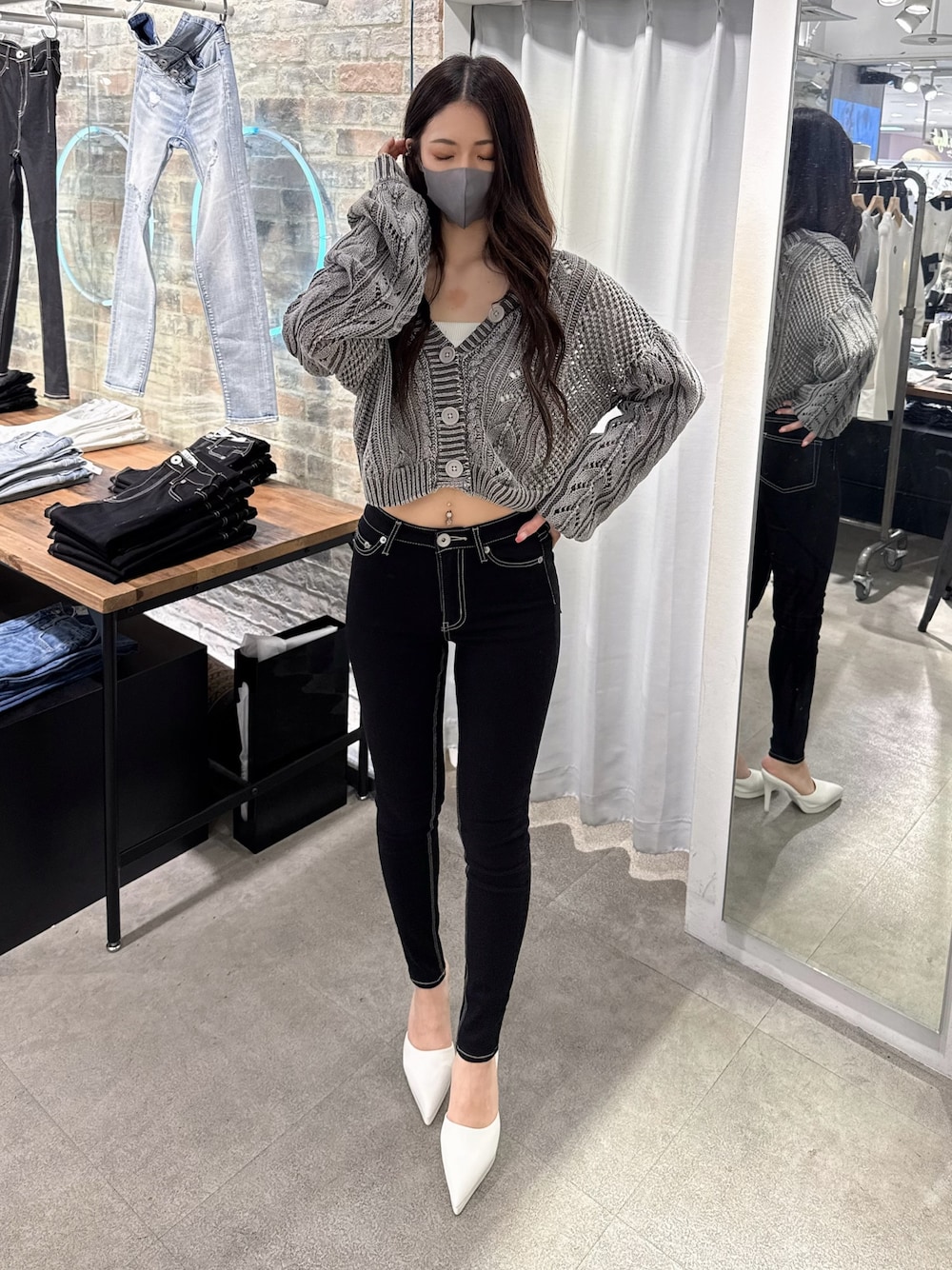 〈インナー〉 チェーンが取り外しできるビスチェです✨ 羽織の下にインナーとしても着用できますが 暖かくなれば1枚でも着用できます! 〈トップス〉 前後着用可能でカーディガンとしても使用できる大人気のブリーチニットです♡ デニム合わせはもちろん羽織として使用したりビスチェ合わせなど幅広く使えるアイテムです😊 〈デニム〉 GYDAでも人気なデニムワンウォッシュスキニーデニムパンツのミドルウエスト丈です🫶 シンプルなデザインで伸縮性も抜群なのでデイリー使い間違いなしです😊 キレイめなコーデからカジュアルなコーデまで幅広く着用できます! 私は156cmでXXSを着用してます♡ 〈シューズ〉 GYDA定番のポインテッドミュールにストームが追加されより高低差や安定感がアップしたミュールです♡ ストームがあるおかげで1日履いていても疲れにくいです!美脚、脚長効果抜群です✨ 私は23.5cmで普段はMサイズですが馴染んで緩くなるのでSサイズ着用してます🩷