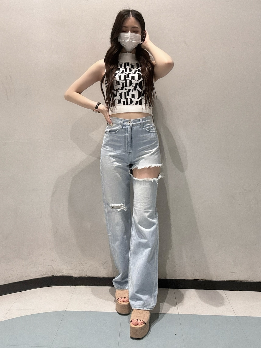 〈トップス〉 オリジナルの大胆なジャガードロゴがポイントのアメスリニットトップスです🫶 タイトなシルエットなので体のラインが綺麗に見えます✨ デニムとの相性は抜群でデニム合わせも可愛いですがショートパンツやミニスカート合わせも可愛いのでオススメです🩷 〈デニム〉 GYDAで定番大人気のサイドリップドのワイドデニムです♡ 太ももの所を大胆にカットしたダメージ感と綺麗めなシルエットはGYDAらしいです✨ 私は156cmでXSサイズを着用してます! 丈間は厚底のシューズを合わせれば問題なく着れました🫶 〈シューズ〉 コルクサンダル履いてみました♡ 足をしっかりとホールドしてくれてオープントゥなので通気性が良く夏の暑い日でも快適に履けちゃいます😊 とても軽い履き心地で厚底なのでスタイルアップはもちろん長時間履いていても疲れにくいのが嬉しいポイントです🫶 デニムからワンピースミニ丈のボトムスと幅広く使えてリゾートやバケーションなどの様々シーンでも使えちゃいます! 私は23.5cmでMサイズ着用してます✨