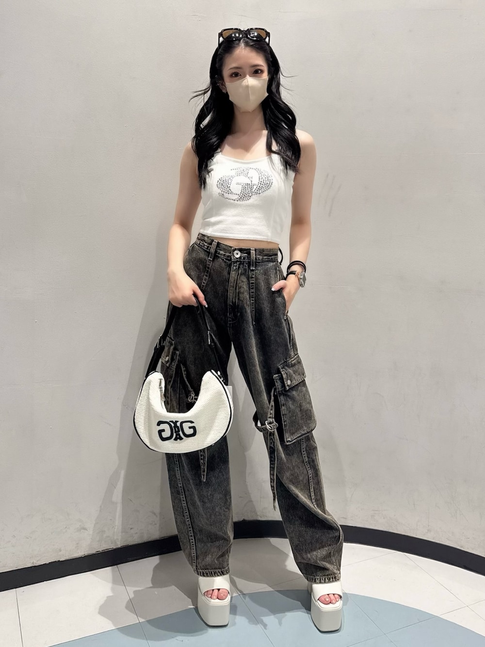 〈トップス〉 大きめのロゴが可愛いニット素材のビスチェです✨ コルセットラインが女性らしいボディラインを強調してくれます😊 〈ボトムス〉 カーゴとワイドそしてデニムを掛け合わせたトレンド感たっぷりで幅広い着こなしが叶うカーゴパンツです🫶 ヴィンテージ感のある色落ちが特徴的でベルト&ディテールも個性を出してくれる1本です♡ ショート丈のトップスやビスチェ合わせがオススメです🩷 私は156cmでXSサイズ着用してます🐰 〈シューズ〉 サッと履ける履きやすさ、ヒールは高いですが太めのヒールなので安定感に優れており高さもあるのでスタイルアップ効果抜群のサンダルです♡ シンプルなのでどんなコーデにも合わせやすいです😊 美脚効果抜群なのも嬉しいポイントです! 私は23.5cmで普段はMサイズが多いですが 今回は少し大きめの作りをしていたのでSサイズ履いてます🫶 〈バック〉 雑素材で夏らしいハンドルBAGです♡ ベルトの部分が調整可能です! 大きめのロゴがインパクト大ですが、シンプルに使いたい時は前後を逆にすれば無地見せでも使っていただけます✨ カジュアルなコーデにはとっても合わせやすいですが女性らしいコーデにも合わせれるので普段使いしやすいバックです🩷 〈サングラス〉 四角いフレームと太めのフチが特徴的なサングラスです✨ レンズが大きめなので小顔効果抜群です😊 私は頭に乗せて夏らしくコーデのワンポイントにして使ってみました🩷🐰