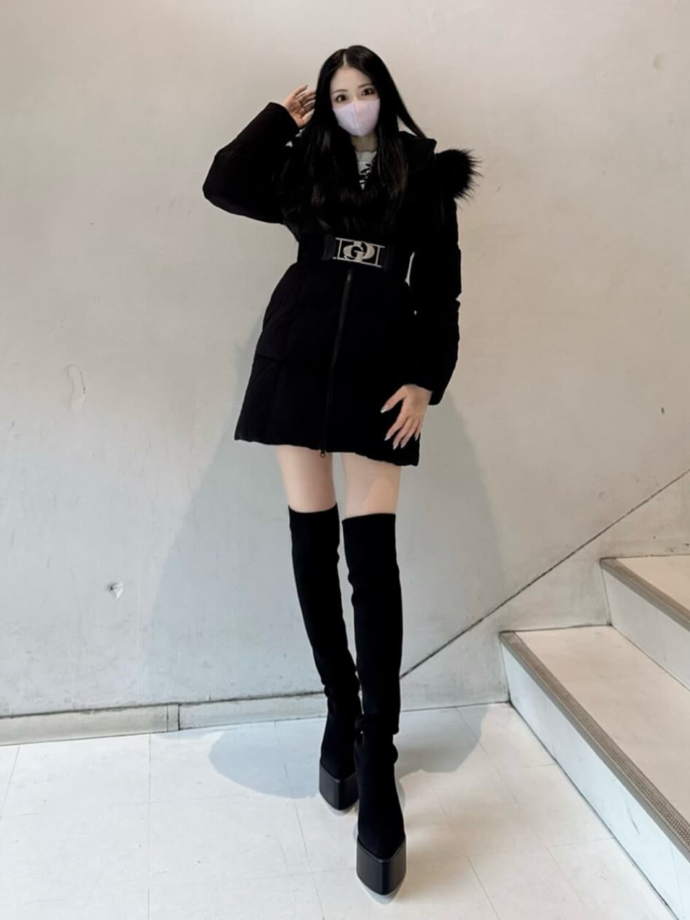 〈トップス〉 GYDAオリジナルの総柄がシンプルなコーデにも華を添えてくれます♡ 程よいフィット感で生地感もとってもあったかいです😊 ミニ丈なのでどんなボトムスにも合わせやすいです! 〈ボトムス〉 bijouが前面に施されたデニムスカートです♡ シンプルだけどランダムなビジューが印象を華やかにしてくれます🫶 デイリー使いしやすいです! インナーパンツ付きなので安心して着用できます😊 私はXSサイズ着用してます✨ 〈アウター〉 GYDAの冬のアウターと言えばの毎年大人気ベルト付きロングダウン着てみました♡ 今年はサイズがS,Mになりました! 今回はミニボトムスで合わせていますがデニム合わせもGYDAらしいコーデになります😊 リアルダウンを贅沢に90%も使用しているのでとっても暖かいです🫶 細身の作りなのでとってもスタイルアップして見えます🩷 私はSサイズで着用してます! 〈シューズ〉 ニット素材のニーハイブーツです♡ ニット素材なので伸縮性もよく足にフィットしてくれるので超絶美脚の脚長に見えます😊 着脱もしやすいです! ヒール高いですが厚底になっているので安定かもあり歩きやすく疲れにくいです🫶 私は23.5cmでSも履けましたが少しキツく感じたのでMサイズ着用して中敷きで調整がちょうど良かったです🩷