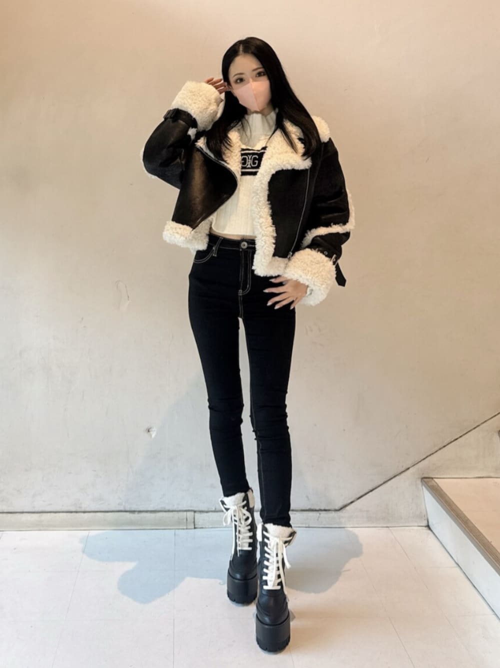 〈トップス〉 女性らしい触りたくなるような、ふわふわとした素材がとっても気持ちいいです♡ プチハイネックなので首元まで暖かいです😊 インナーも着れるゆとりがあるのに着膨れしないのが嬉しいポイントです🫶 〈ボトムス〉 GYDAで定番のスキニーワンウォッシュを履いてみました! ストレッチ性抜群で動きやすいです♡ 内側のステッチが足をより細く見せてくれます😊 シンプルなのでカジュアルにも綺麗めにも使えるデニムです🫶 わたしはXXSサイズ着用してます! 〈アウター〉 トレンド感のエコファームートンジャケット着てみました! 寒い冬でもスタイリッシュに決まる主役級アウターです♡ ミニ丈なのでデニムとミニ丈のトップスと合わせてカジュアルな着こなしでも可愛いですが ワンピースとの合わせも可愛く着れます🩷 〈シューズ〉 ヒールは高いですが厚底になっているため長時間履いていても疲れにくく歩きやすいです♡ ヒールが高いおかげで美脚効果も抜群です! ボアが一気に季節感出してくれます😊 私は23.5cmで普段はMサイズですがSサイズでちょうど良かったです🫶