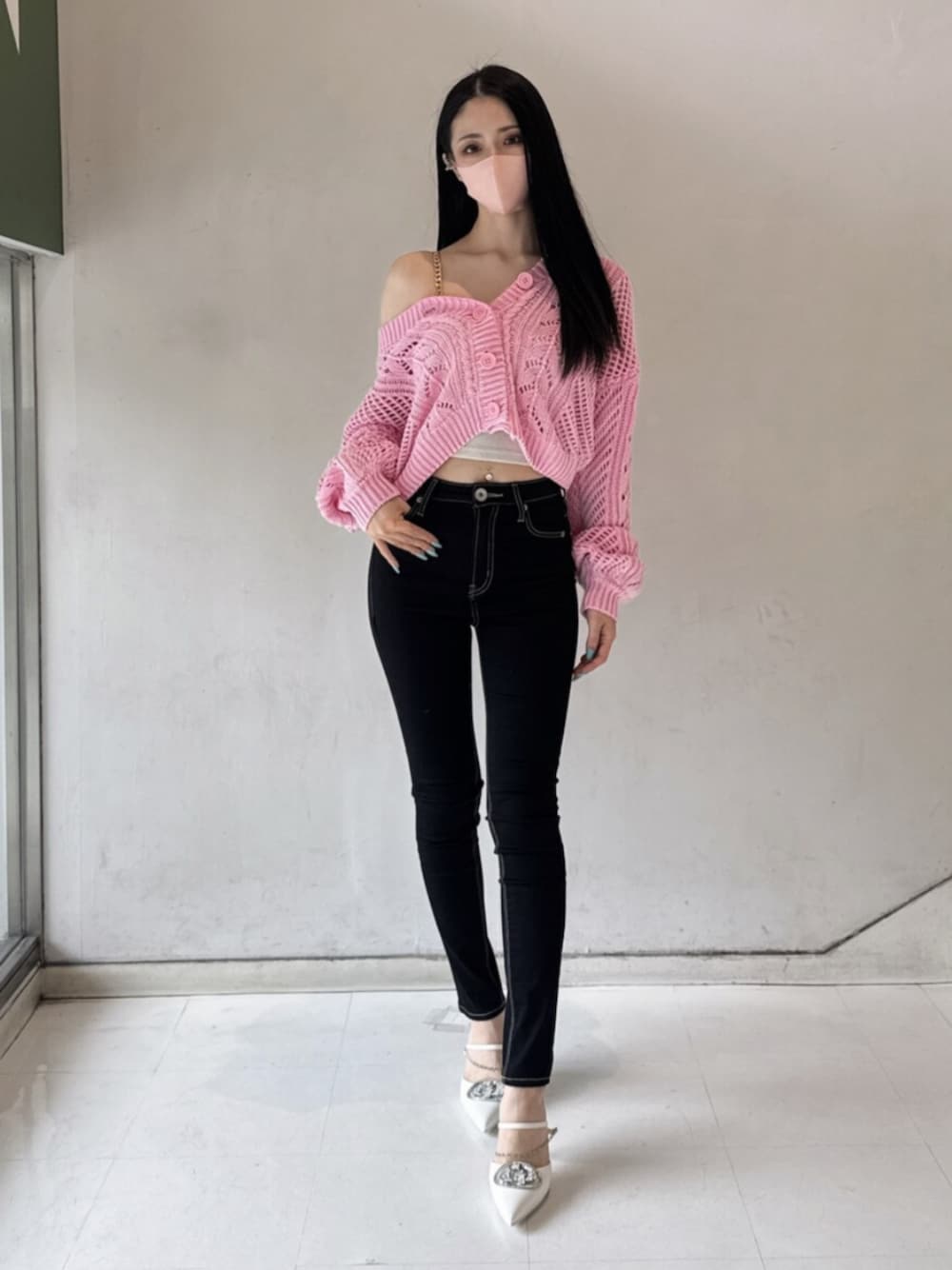 〈インナー〉 取り外し可能なチェーン付きのビスチェ♡ 今回は生地にラメが入っているので1枚で着用した時も存在感を出せます🫶 〈トップス〉 毎回大人気の2wayメッシュブリーチニット♡ 前後好きな方で着用可能です😊 春らしいピンクのカラーで季節感を出してみました🫶 ボタン外して着用すると羽織りとしても使えるので1枚あると着回しコーデができます🩷 〈ボトムス〉 GYDA定番のワンウォッシュスキニー♡ ストレッチ性が効いているのでとっても履きやすく動きやすいです😊 美脚効果抜群なのも嬉しいポイントです🫶 シンプルなのでどんなコーデにも使いやすいです!私はXXSサイズ着用してます🐰 〈シューズ〉 ポインテッドが美脚効果抜群のミュールです♡ ビジューとチェーンが取り外せるのでお好みのスタイリングで使用できます🩷 履いていくと馴染んでくるので 私は23.5cmでSサイズ着用してます🫶