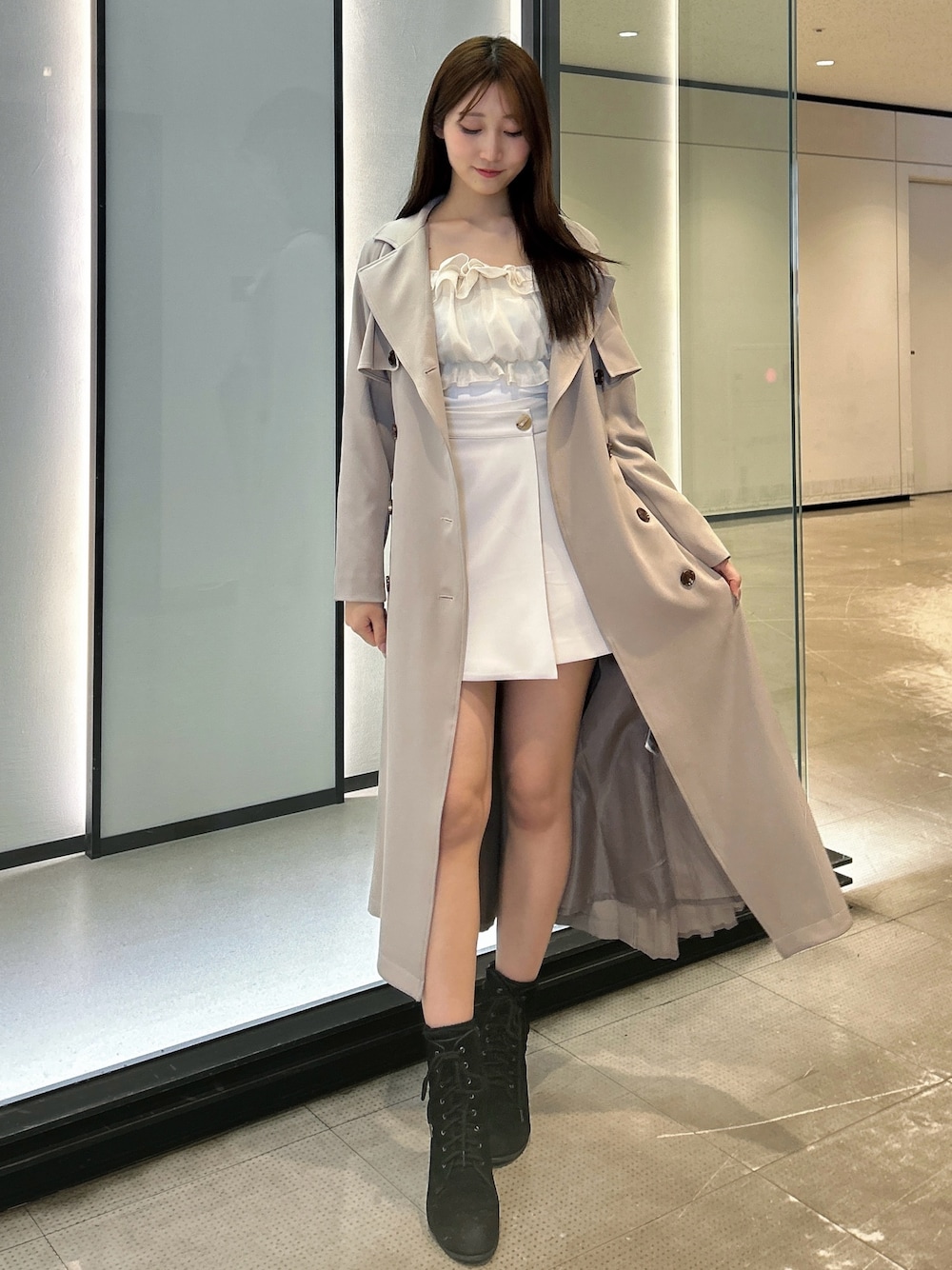 【トップス】 オフショルとしても着れる2wayタイプ♡ チュールもドッキングになっているので程よいボリューム感を出してくれます♪ オフホワイトではなくアイボリーに近いお色味なので肌馴染みがよくワントーンコーデにも合わせやすいです✨ 【スカート】 ラップ風でインパン付きのデザインです☺︎ ハイウエストでスッキリとラインを綺麗に見せてくれます♪ 後ろはゴムで伸縮性も抜群✨ 履き心地の良いアイテムです♡ 【アウター】 サイドにプリーツが入っている春物のコート🧥 ダブルボタンデザインで着太りしないデザインです♪