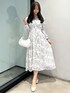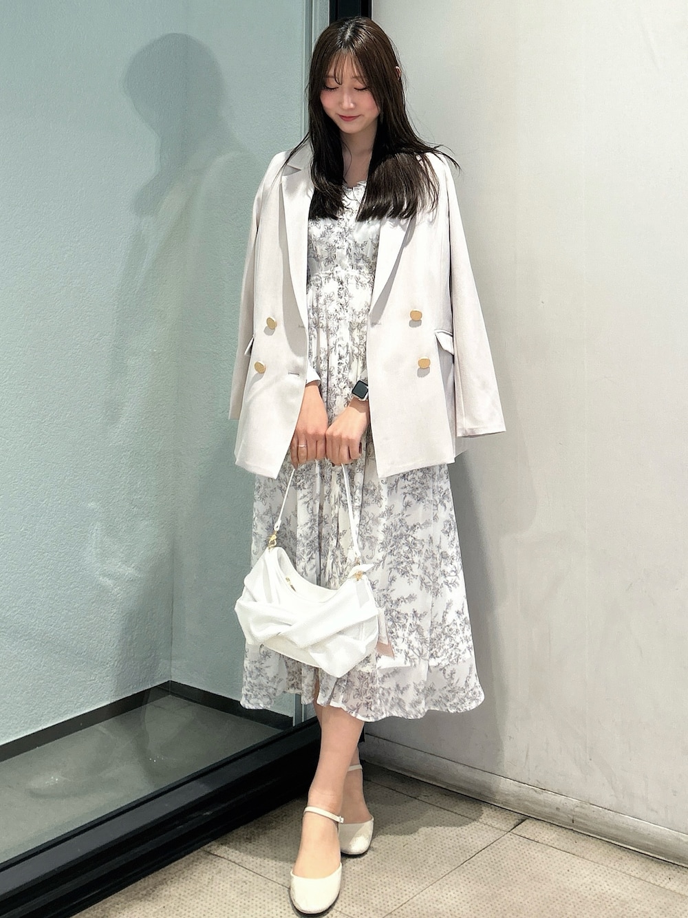 【ワンピース】 シフォン素材で柔らかく揺れ感のあるフレアワンピース👗 ウエストは紐付きで後ろでリボン結びをするこで調節可能です✨ ショルダー部分はフリル付きのデザインで腕にかけて少し空いているデザインなので程よい肌見せが叶います☺︎♡ 白地にグレーで花柄が描かれているので甘めデザインですが大人っぽかわいいコーデを組めそうです✨ 【ジャケット】 形が綺麗なテーラードジャケットで、シンプルなデザインな分ラインが引き立つアイテムです♪丈感も程よくフィットしすぎずヒップにかかるぐらいの丈感なのでワンピースはもちろん、デニムパンツ合わせや、スラックスと合わせてオフィスコーデにも最適です♡ 【バッグ】 紐が2種類あり、画像のシンプルな紐とビンテージ感のあるストーンデザインでTPOに合わせて使い分けいただけます✨ 内側には2つポケット付きで、片方は便利なファスナー付きです♪