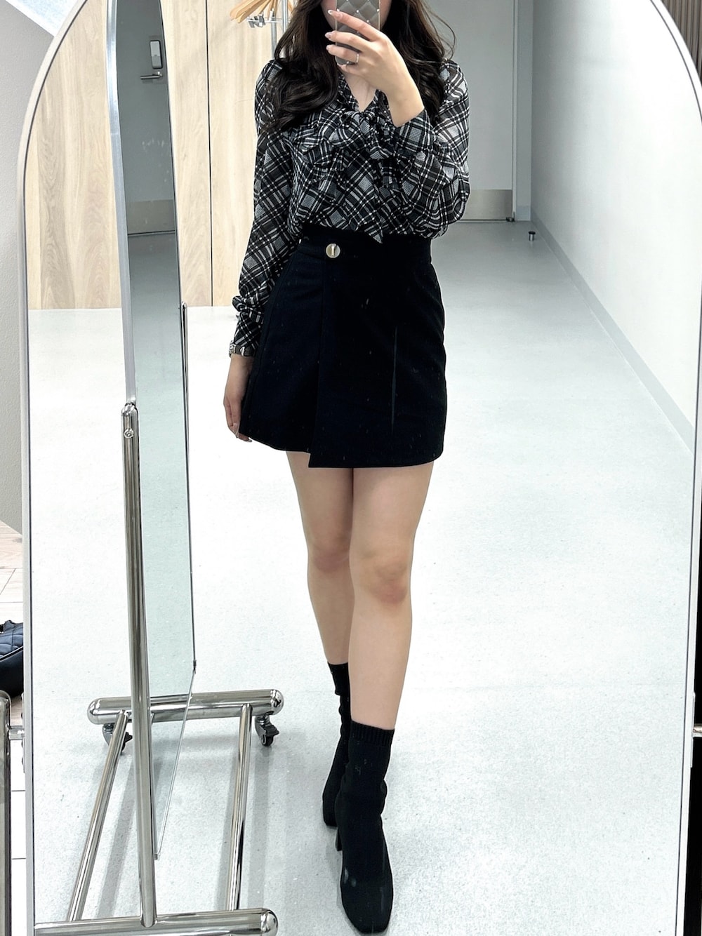 【トップス】 前あきのブラウス♡ フリルとリボンのデザインがかわいいです♪ 触った感じ着用しているMIXの色味の生地感が、3色の中で一番シアー感がある素材です☺︎ きっちりし過ぎないゆるっと感があります✨ 今回は一番上までボタンを閉めず、リボンも少し緩めに結んでみました♪ 【スカート】 ラップ風デザインでインパンつきです✨ 程よくハイウエストでスタイルアップ♪ ウエストの後ろにはゴムが入っていて伸縮性抜群🙆♀️ 履き心地も良いです♡