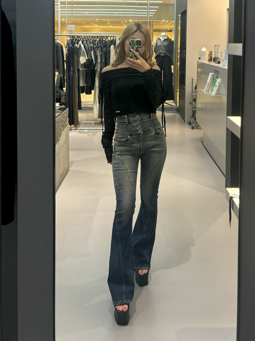 【tops】 レースのオフショルトップスです❤︎デコルテをスッキリ見せてくれるので華奢見え効果のあるトップスです!レースなので上品に着ていただけます✨ 【jeans】 大人気のフレアデニムからグラデーションカラーが誕生しました!切り返しデザインが細見え効果抜群です✨伸縮性があるデニムなので履き心地も良いです🙆🏻♀️ 【sandal】 この厚底サンダルはEMODAのフレアデニムとの相性が抜群です!23.5センチでMサイズが丁度良いです!