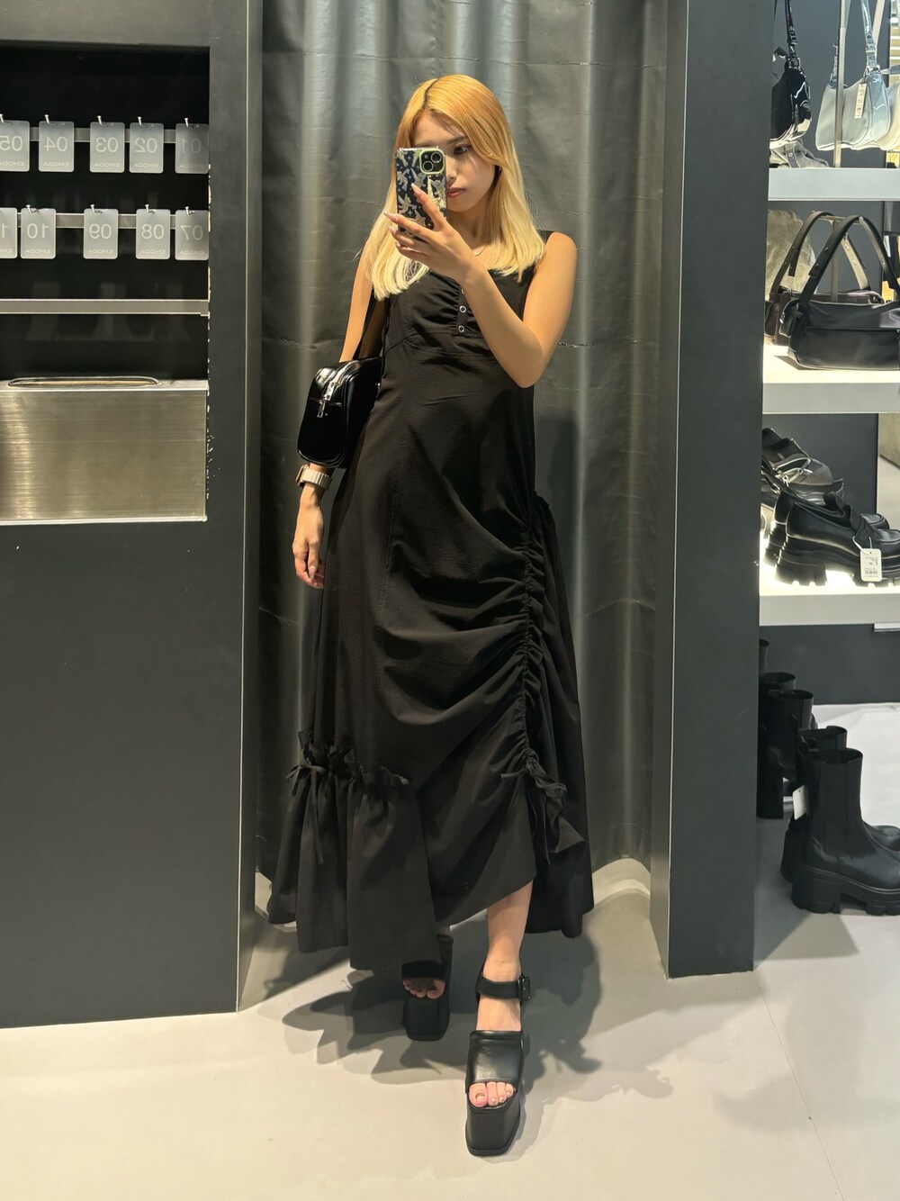 【ワンピース】 大人気のギャザーマキシワンピです!ギャザーは調節ができるので、お好みの高さで絞ってみてください❤️背中部分に伸縮性もあるので、着やすく細見え効果抜群です✨ 【サンダル】 厚底13㎝のサンダルなので、履くだけで激盛れします✨23.5㎝の私でMサイズがちょうど良いです! 【バッグ】 シンプルなバッグなので、どんなコーデにも合わせやすいです!ペットボトルも入れられるぐらいの大きさになってます!