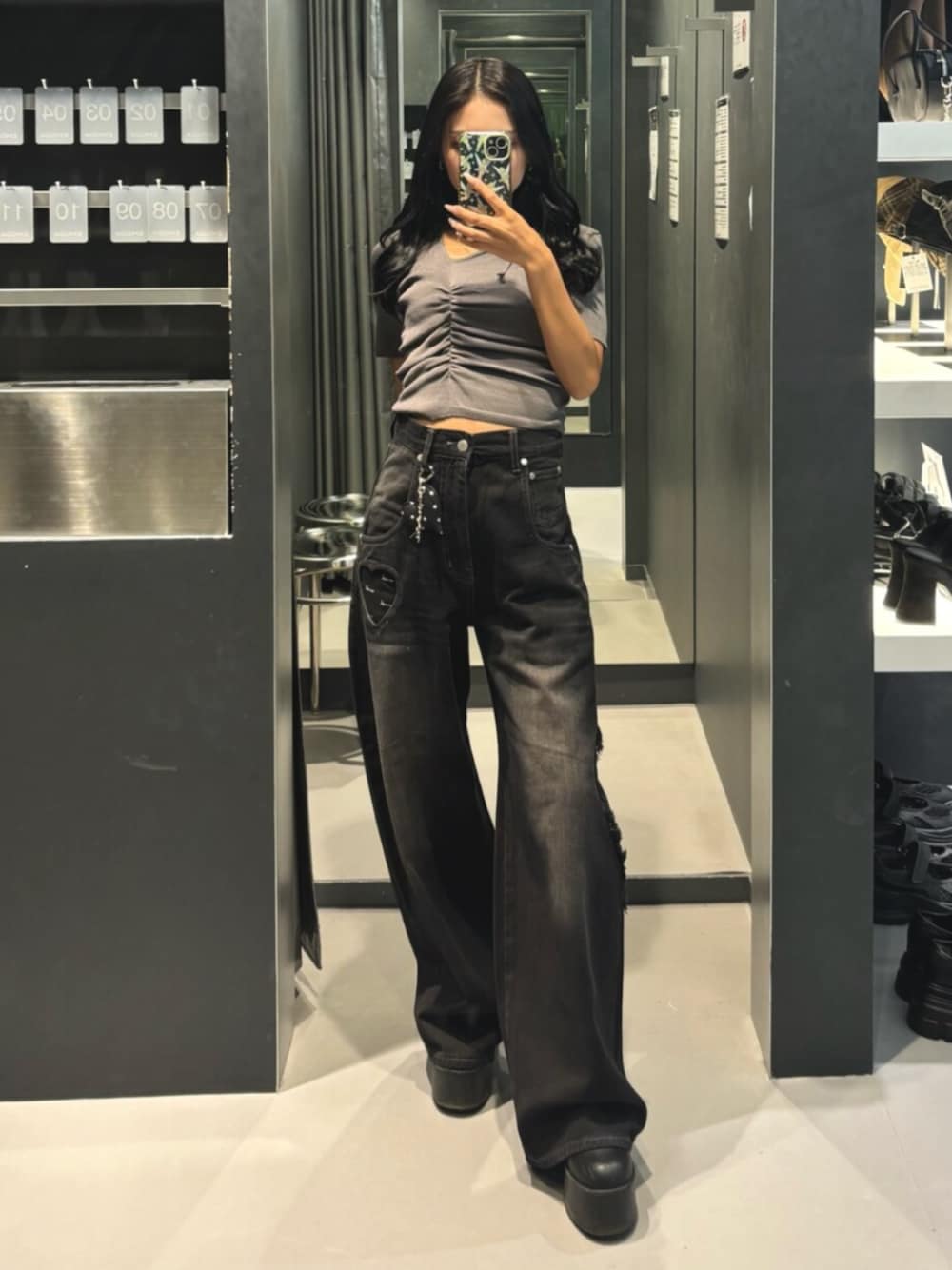 【tops】大人気のチョーカー付きのトップスです!ギャザーのデザインがウエストを自然と細く見せてくれます❤︎首元もスッキリ開いているので、ニット素材だけど重たい印象にならず使っていただけます🙆🏻♀️ 【denim】 EMODA15周年記念のデニムです❤︎着用した黒は、ハートのデザインでも甘すぎない印象になるので色々なトップスに合わせやすいです✨ 【boots】 厚底10センチのショートブーツです!足を出す時のコーデにも、ワイドデニムやフレアデニムの下にも合わせられる万能なブーツです!普段23.5センチの私でMサイズが丁度良いです!