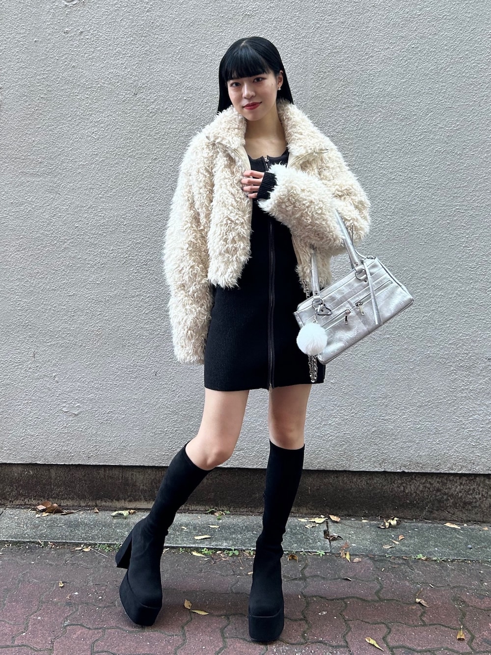 ✴︎OUTER SNSで注目を浴びたブルゾンがついに登場!クロップド丈なので低身長の方でも着やすいアイテム✨ジップ全締めしてハイネックにして着るとマフラーなしでも暖かく着れます☺️ ✴︎ONEPIECE デコルテがしっかり見えるタイトミニワンピ👗ダブルジップデザインでトレンド感のあるデザイン。スタイルアップ間違いないアイテムです✨ ✴︎SHOES 普段24.5cm着用Lサイズで少しゆとりがあります。