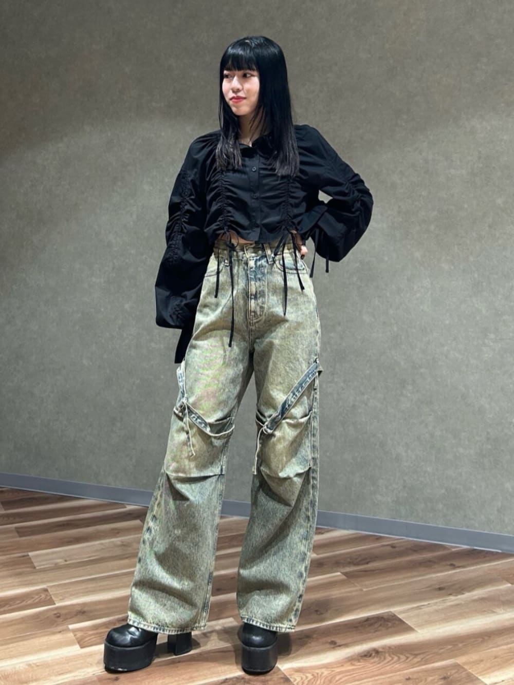 ✴︎tops ギャザー入りのクロップドシャツ👔ボリューム感のあるシルエットで一枚でも使いやすいアイテムです☆ ✴︎denim Sサイズ着用少しゆとりがあります。 サイドにディティールの入ったデザインデニム👖ワイドなデザインだけど細見えもさせてくれる優れものです👀🫶🏻 ✴︎shoes 24.5cm Lサイズ着用ちょうどいいです。