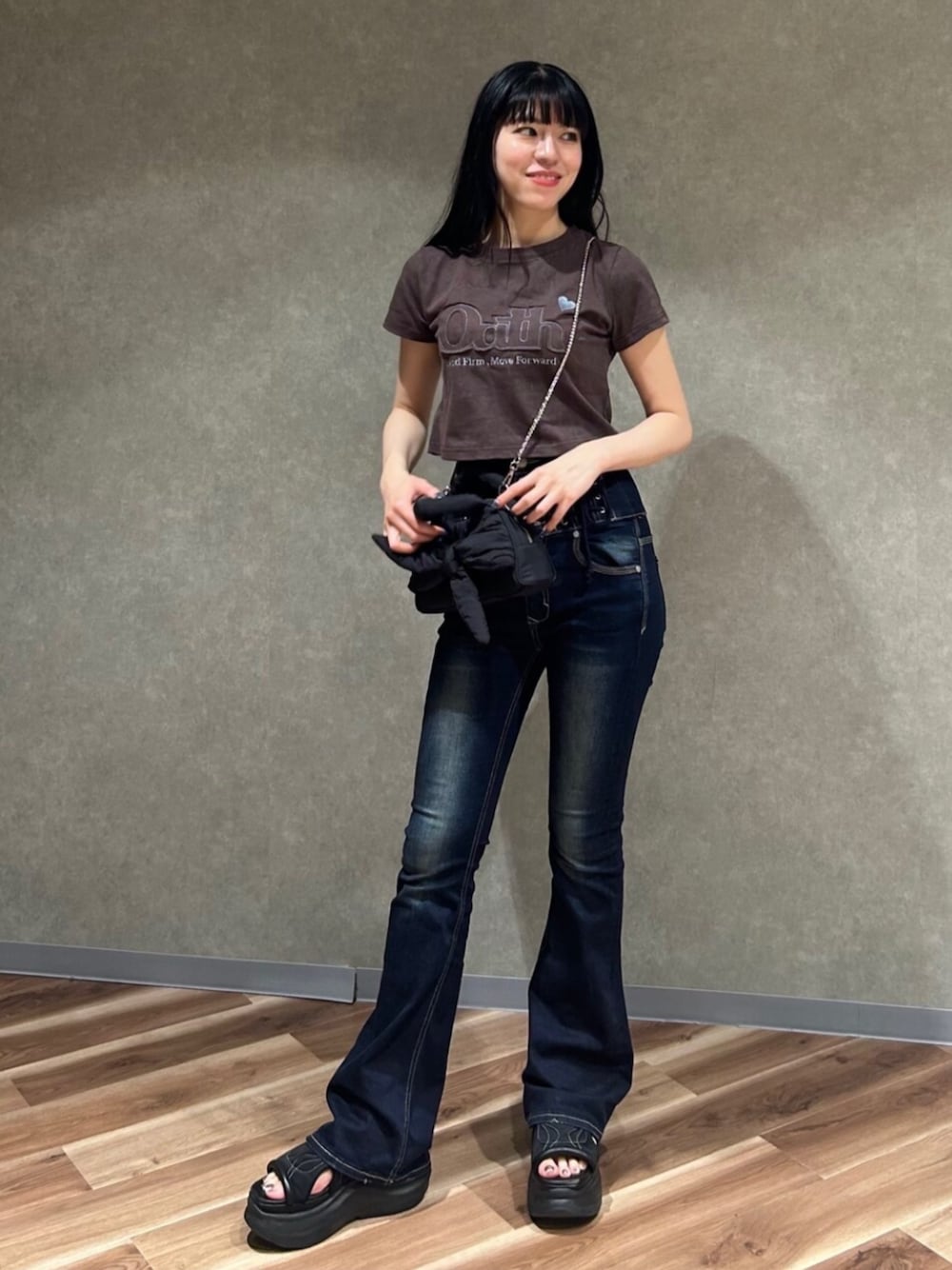 ✴︎トップス パッチロゴ付きのクロップドトップス、幅がありピタピタしすぎないのがポイント☝️ハイウエストともローウエストとも相性良しです🌟 ✴︎デニム xsサイズ着用、少しゆとりがあります。 レースアップのハイウェストフレアパンツ🎀 腰にある編み上げで骨盤の強調を抑えてくれるので体型補正もしてくれちゃいます👖 ✴︎シューズ 24.5cm Lサイズでゆとりがあります。