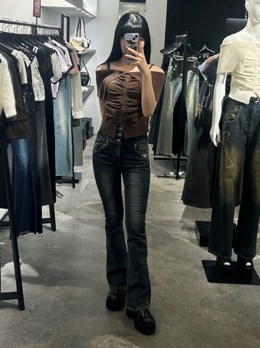 ✴︎トップス 店頭で大人気のフロントボタンのオフショルダートップス⭐️肌触りのいい質感で着やすく、タイトすぎないのにフィットしてくれるのでどの骨格でも着れちゃいます♪ ✴︎デニム XSサイズ着用ちょうどいいです。 スーパーハイウエストフレアパンツの新色登場✨履くだけで脚長効果抜群のデニムです👖 ✴︎シューズ 24.5cm Lサイズで少しゆとりがあります。