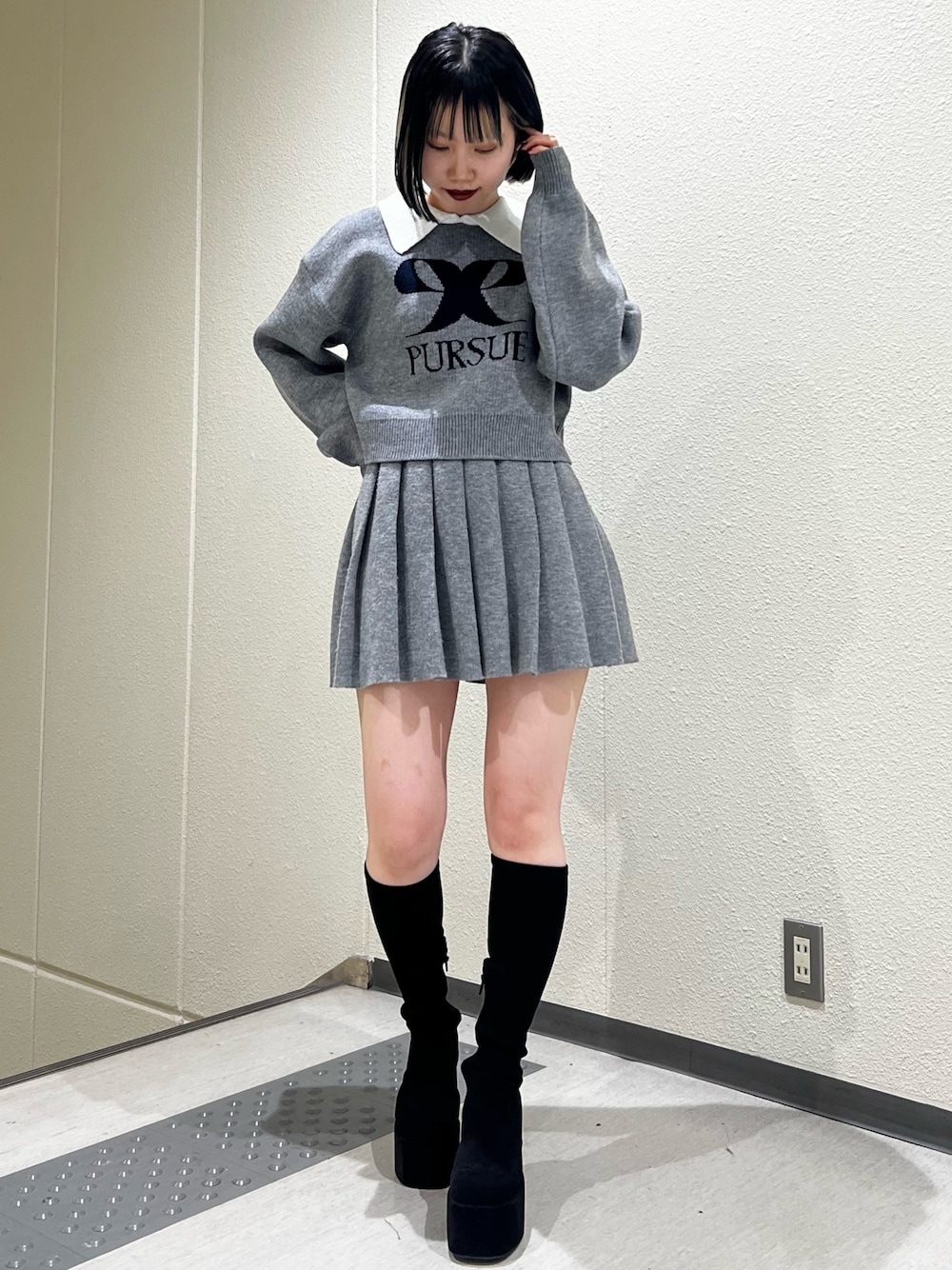 【トップス】今年トレンドのリボン୨୧ 袖が長くて襟付きなのがかわいい🩷ゆとりのあるトップスですがショート丈なのでタイトめなスカートやスキニー、フレア以外にダボっとしてるワイド系のボトムスで合わせてあげてもスタイルアップしてみえます✨ 【スカート】インパン付きスカートなので安心💕プリーツスカートでは珍しいニット素材で、ウエストもゴムになってるので凄く履きやすいです! 【シューズ】足長効果もあり、厚底ブーツにしては軽くて歩きやすい‼︎ ストレッチ抜群で引き締め効果もあるので脚を綺麗に見せてくれます!! デザインもシンプルでずっと使っていただけますし、特に秋冬は大活躍します🖤(普段22.5~23cmでSサイズ着用)