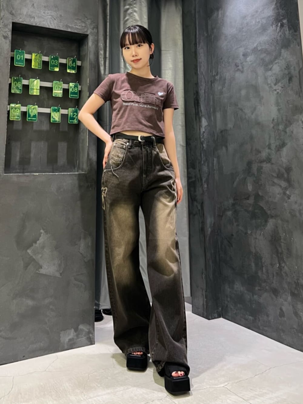【トップス】クロップド丈なのでハイウエストパンツと相性⭕️‼︎ピッタリしすぎず、ゆとりありすぎずで1番使いやすいサイズ感✨ デザインの存在感もあるのでお洒落映え🩷 【デニム】安定のハイウエストでワイドすぎずストレートすぎない綺麗なシルエット✨両サイド大きさの違うリボンがあって可愛い🎀 157cmSサイズ着用で12cmの厚底履いて良いくらいでした🙆🏻 【シューズ】ヒール約12cmありますが、前も厚底になっているので傾斜なくて歩きやすい‼︎足首固定はないですが、足の甲部分の固定範囲が広いので安定感もある✨ つま先デザインもスクエアでデニムから見えるのが可愛い🩷