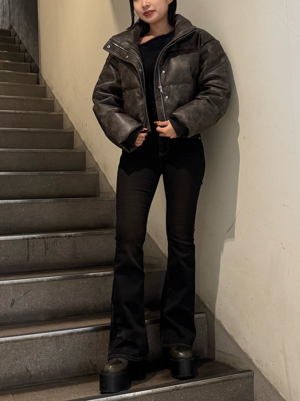 松本つづみ(EMODA)のダウンジャケット/コート「フェイクレザーショートダウン」を使ったコーディネート
