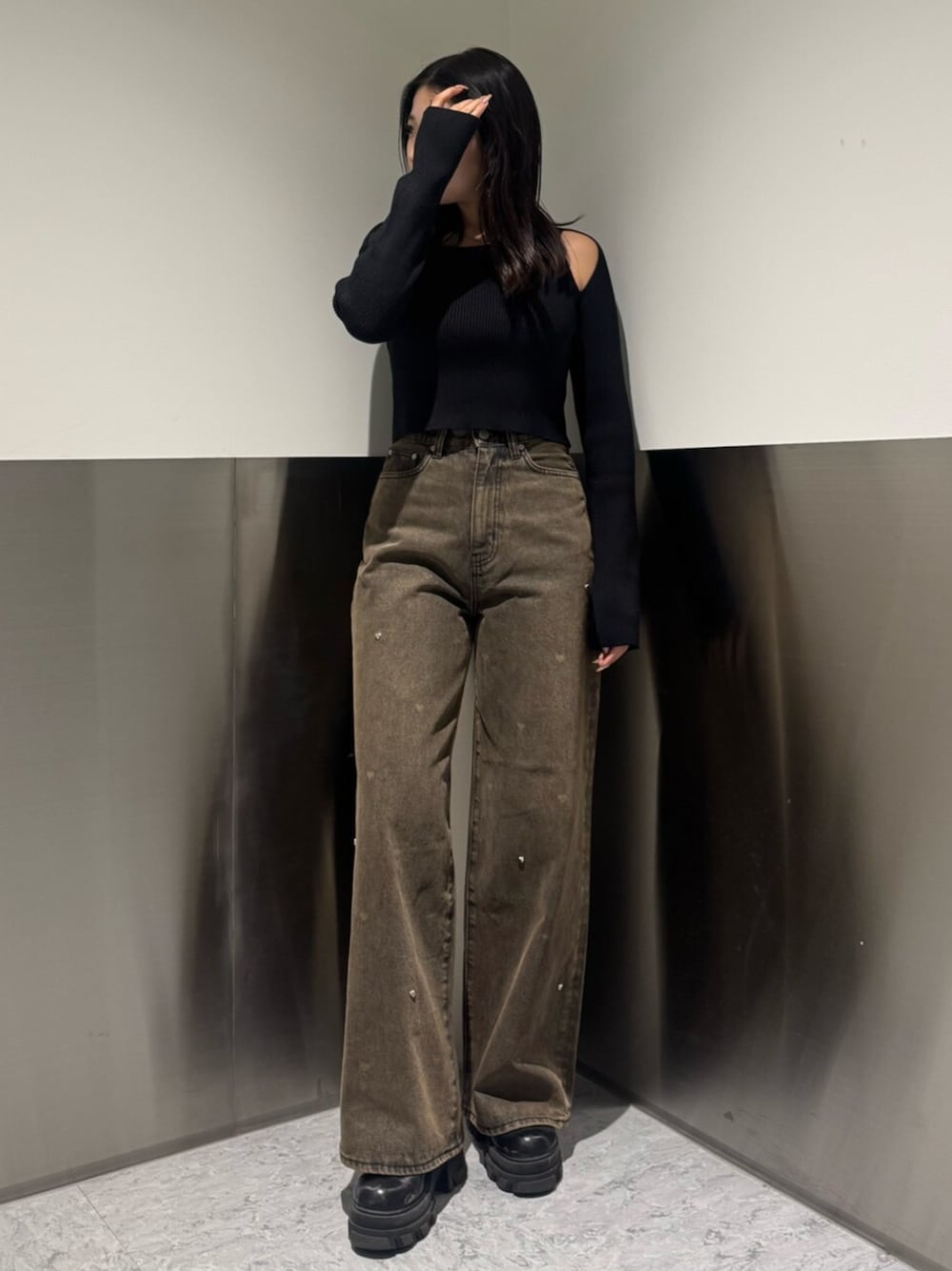 [トップス]ピタッとした肩空きデザインのニット🖤リブ素材なので、シルエットを拾いすぎず綺麗に着れます✨ [デニム]ハートのドットがデザインされたかわいいデニム🤎スタッズも付いてるのでおしゃれに着れます💫158cm/Sサイズで若干長めの丈感です! [ブーツ]厚底8cmのタンクブーツ🖤高低差がないのでめちゃめちゃ履きやすいのと、しっかり安定感もあるので安心して履ける厚底です🫶🏻23.5cm/Mサイズでぴったりのサイズ感です!