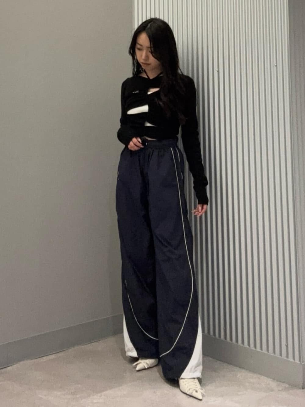 【トップス】ランダムにデザインの入ったニットがオシャレ見え🩷 チョーカーは取り外しできます◎ 【パンツ】ナイロンパンツは薄手でシャカシャカ素材でとっても楽ちん🎵 裾を絞っていただけるので低身長の方でも🙆🏻♀️ 【シューズ】かかとのベルトがゴムなのでズレる心配なくとっても履きやすいです 9cm盛れるので151cmの私でもワイドパンツとも合わせれます🫶🏻