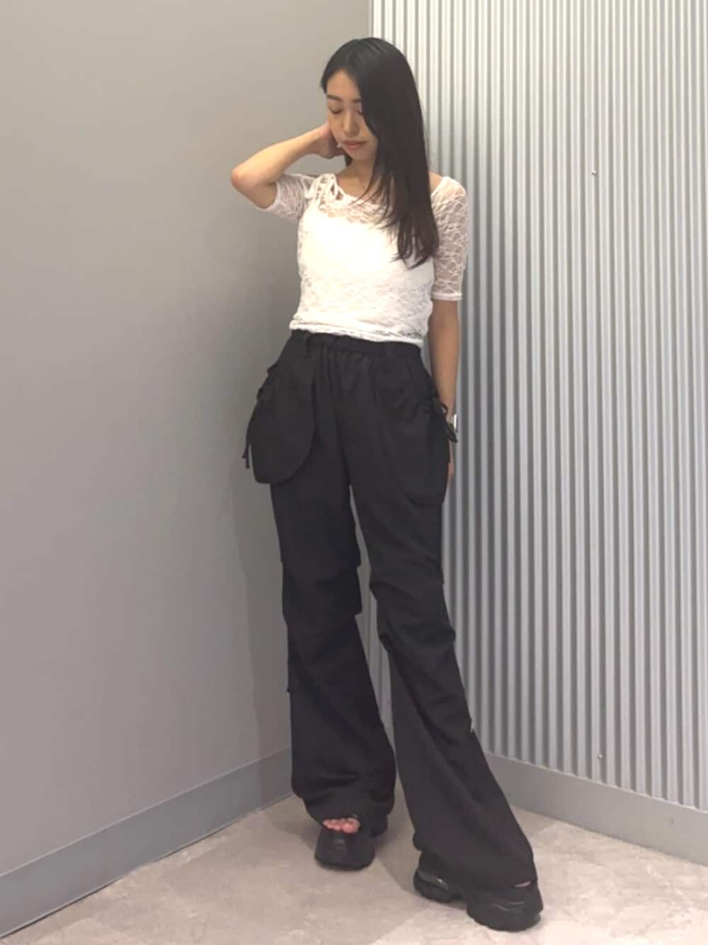 【トップス】 レースですが程よい露出があり甘くなりすぎず大人っぽく着ていただけます♡ カップ付きなのでインナーにも困りません✨ 【ボトムス】 生地が薄めのナイロンパンツで夏は快適に着ていただけます 細身のフレアのシルエットが脚長効果◎ 【サンダル】 ぷにっとした素材が柔らかく、長時間履いても痛くなりにくいです✨ ソール部分も凹凸があり、とっても歩きやすいです