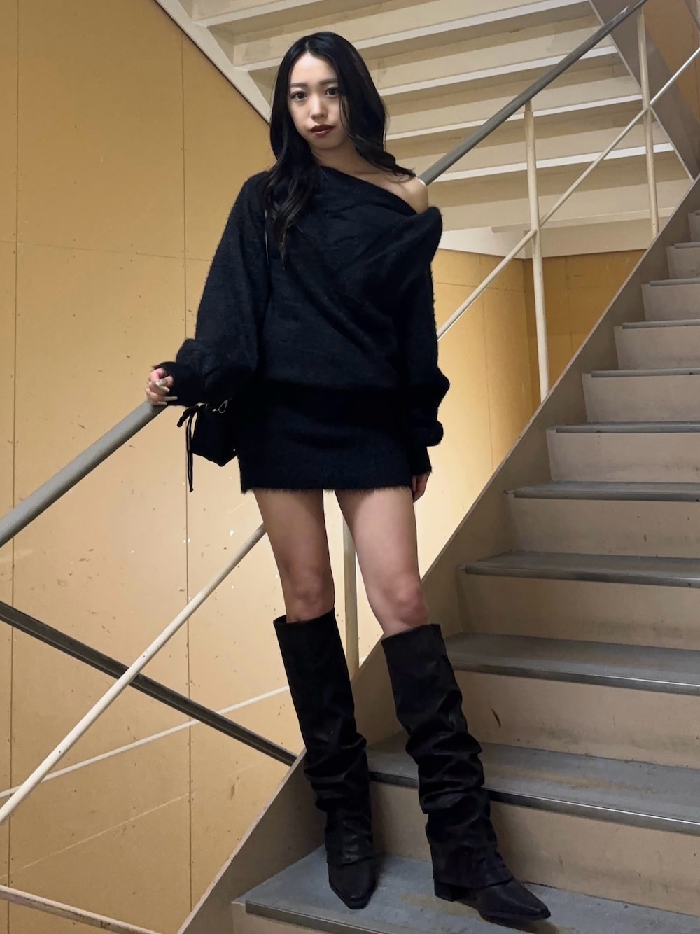 【ワンピース】 ワンショルにもオフショルにもできます! ウエスト位置も調節できるので低身長さんも高身長さんも◎ 【ブーツ】 膝下までのロングブーツです ローヒールでとーっても軽くスポッと履けて着脱もしやすいです✨ 23cmでSサイズ着用しています